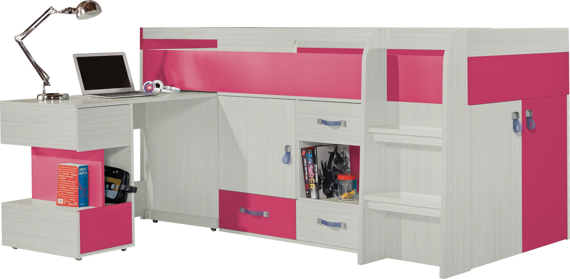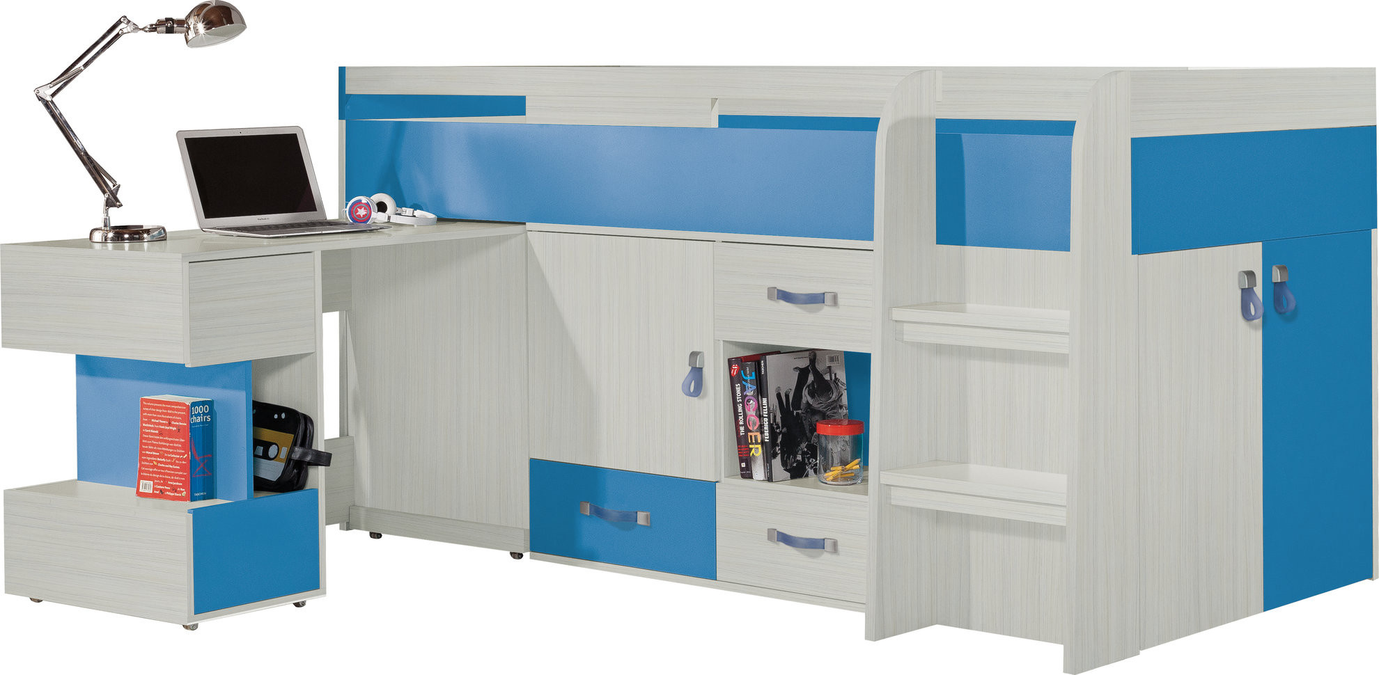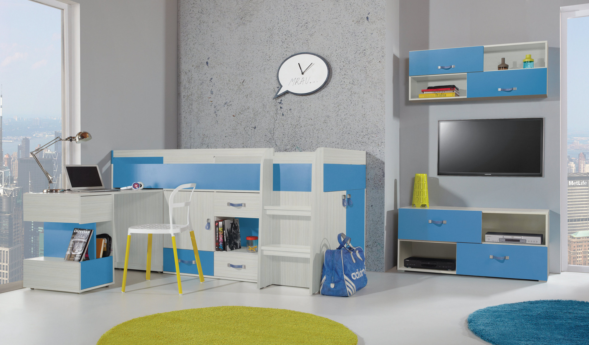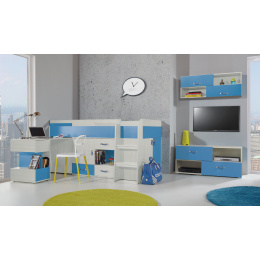 Posteľ Komi je vyrobená z lamina a je zakončená lištou Abs. Posteľ je určená pre 1 dieťa. Posteľ obsahuje úložné priestory a rošty. Matrac a dekorácie nie sú zahrnuté v cene postele.