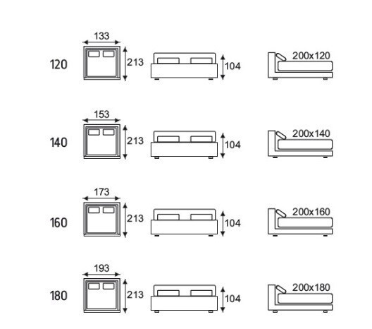 Rozmery: šírka 153 cm, maximálna výška 104 cm a dĺžka 213 cm. Táto posteľ sa ľahko zmestí do väčšiny spální a poskytne dostatok priestoru na pohodlný spánok.