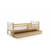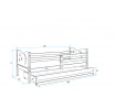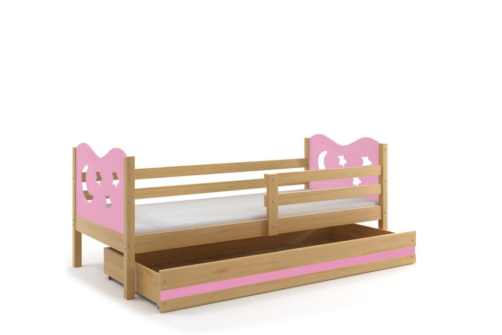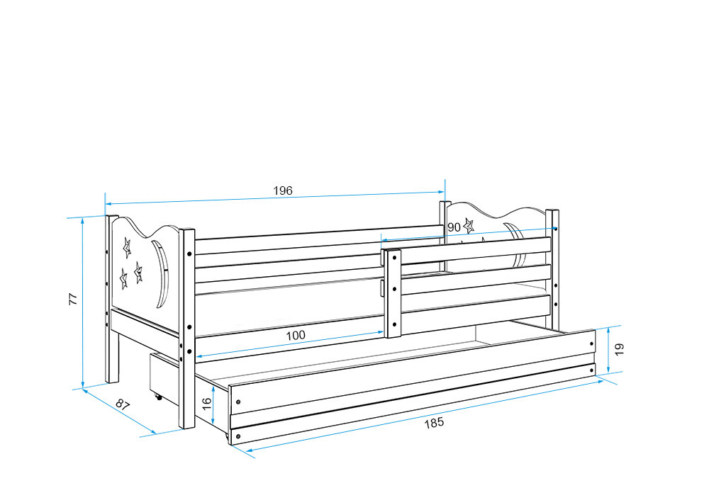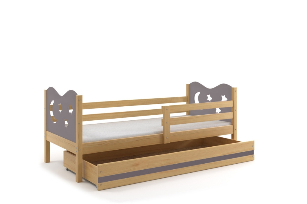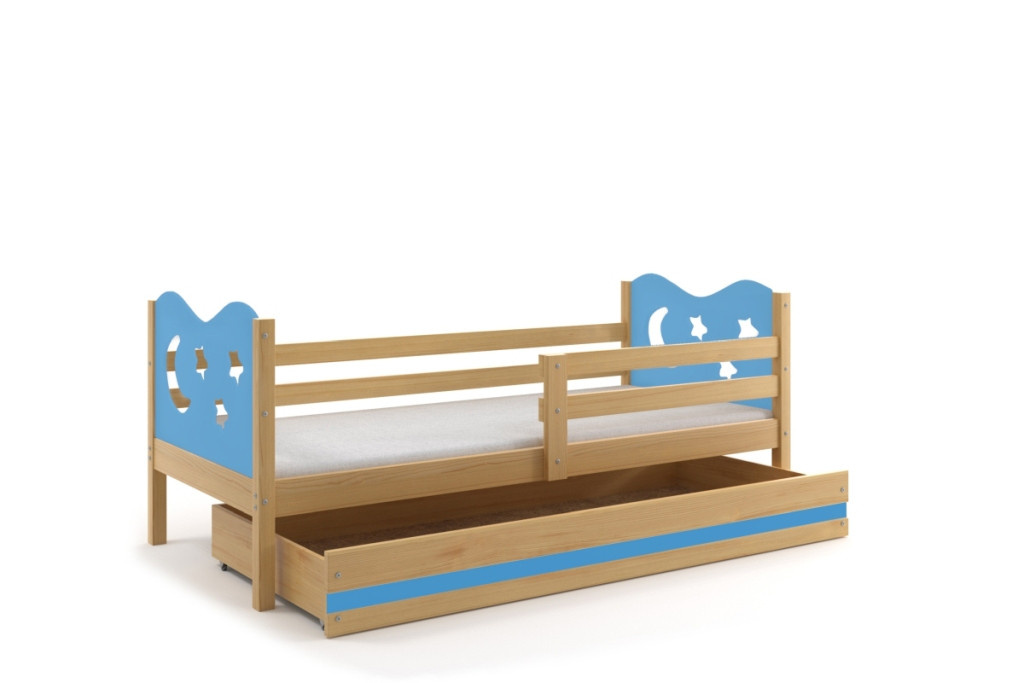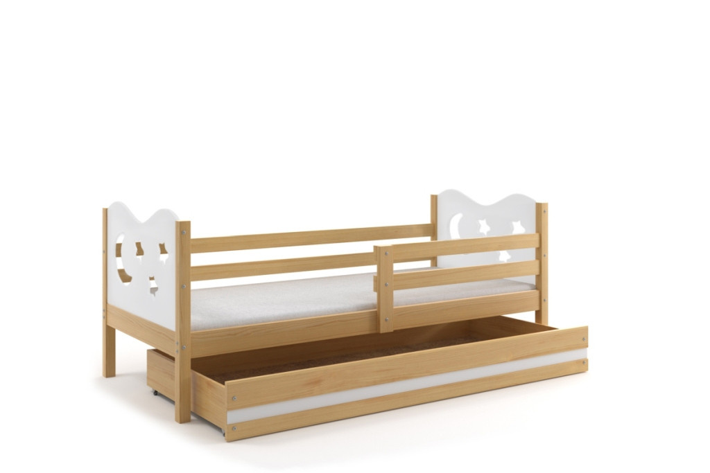 Detská posteľ Miky osloví najmä tých, ktorí pre svoje dieťa hľadajú funkčnosť, moderný dizajn a kvalitu. Posteľ je vyrobená z borovicového dreva, ktoré je lakované vodou riediteľným lakom, ktorý je vhodný pre detský nábytok a spĺňa bezpečnostné normy. Farebné panely s výrezmi hviezdičiek a mesiačikov sú vyrobené z kvalitnej MDF. V cene postele je zahrnutá zábrana, ktorá zabezpečí bezpečný a pokojný spánok vášho dieťaťa. Zábranu môžete podľa potreby umiestniť na pravú alebo ľavú stranu postele. Súčasťou postele je aj praktický úložný priestor na kolieskach, ktorý môžete využiť napríklad. na hračky alebo posteľnú bielizeň, rošt a penový matrac so snímateľným poťahom. Plocha na spanie je80x190 cm. Posteľ sa dodáva v demontovanom stave a obsahuje montážny plán vrátane všetkých potrebných spojovacích prvkov. Posteľ je k dispozícii vo viacerých farbách. Zobrazené príslušenstvo a dekorácie nie sú súčasťou balenia. Zobrazenie farieb na fotografii sa môže mierne líšiť od skutočnej farby.