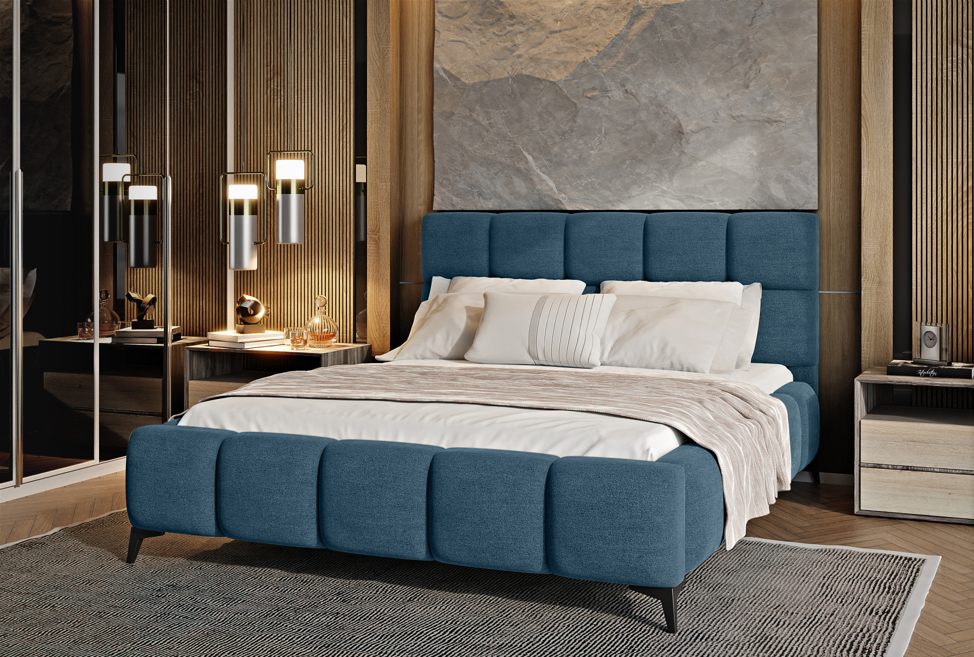 Posteľ Mist je kombináciou moderného dizajnu a glamour štýlu, ktorá prináša nádych elegancie do každej spálne. Opierka hlavy má mäkkú penovú výplň potiahnutú vysoko kvalitným čalúnením. Prešívanie, ktoré zdobí posteľ Mist, pridáva štýl a charakter a prináša nádych modernosti.Nábytok je k dispozícii v troch šírkach spacie plochy: 140, 160, 180 x 200 centimetrov. To uľahčuje prispôsobenie postele podmienkam v byte. Čierne oceľové nohy s dĺžkou až 13.5 centimetrov vytvára dojem, že posteľ sa vznáša nad zemou, čo ďalej opticky zväčšuje miestnosť, v ktorej bude posteľ Mist umiestnená. Okrem toho je nábytok tiež vybavený úložným priestorom na posteľnú bielizeň, čo je veľmi dobré riešenie pre malé priestory a umožňuje udržiavať spálňu upratanú.