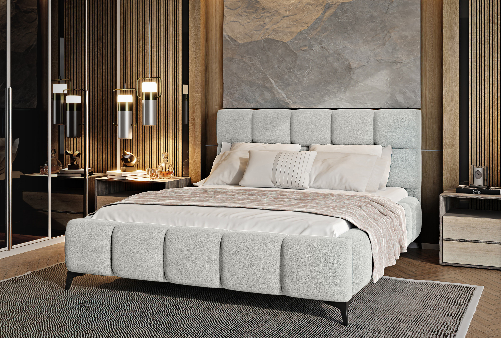 Posteľ Mist je kombináciou moderného dizajnu a glamour štýlu, ktorá prináša nádych elegancie do každej spálne. Opierka hlavy má mäkkú penovú výplň potiahnutú vysoko kvalitným čalúnením. Prešívanie, ktoré zdobí posteľ Mist, pridáva štýl a charakter a prináša nádych modernosti.Nábytok je k dispozícii v troch šírkach spacie plochy: 140, 160, 180 x 200 centimetrov. To uľahčuje prispôsobenie postele podmienkam v byte. Čierne oceľové nohy s dĺžkou až 13.5 centimetrov vytvára dojem, že posteľ sa vznáša nad zemou, čo ďalej opticky zväčšuje miestnosť, v ktorej bude posteľ Mist umiestnená. Okrem toho je nábytok tiež vybavený úložným priestorom na posteľnú bielizeň, čo je veľmi dobré riešenie pre malé priestory a umožňuje udržiavať spálňu upratanú.