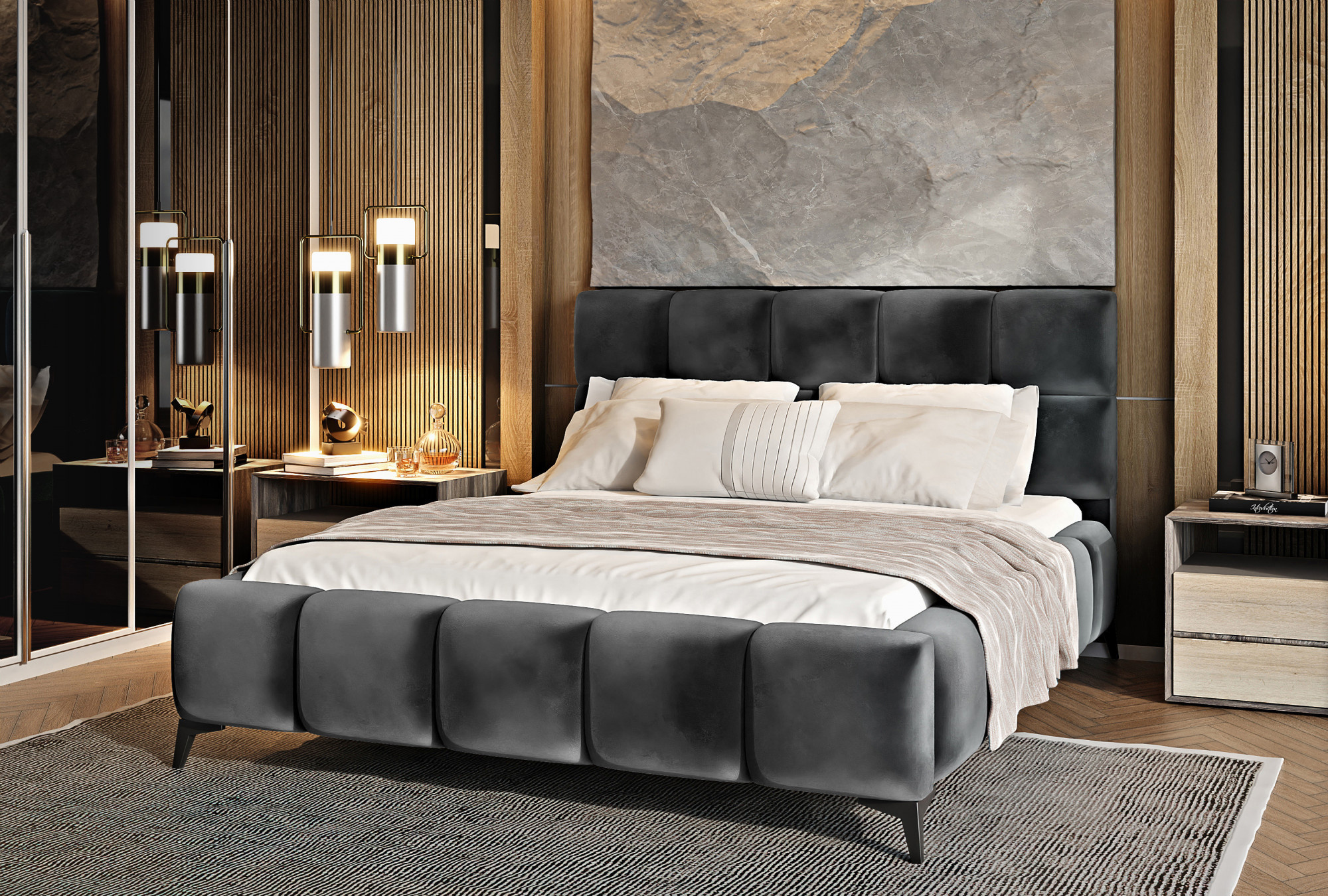 Posteľ Mist je kombináciou moderného dizajnu a glamour štýlu, ktorá prináša nádych elegancie do každej spálne. Opierka hlavy má mäkkú penovú výplň potiahnutú vysoko kvalitným čalúnením. Prešívanie, ktoré zdobí posteľ Mist, pridáva štýl a charakter a prináša nádych modernosti.Nábytok je k dispozícii v troch šírkach spacie plochy: 140, 160, 180 x 200 centimetrov. To uľahčuje prispôsobenie postele podmienkam v byte. Čierne oceľové nohy s dĺžkou až 13.5 centimetrov vytvára dojem, že posteľ sa vznáša nad zemou, čo ďalej opticky zväčšuje miestnosť, v ktorej bude posteľ Mist umiestnená. Okrem toho je nábytok tiež vybavený úložným priestorom na posteľnú bielizeň, čo je veľmi dobré riešenie pre malé priestory a umožňuje udržiavať spálňu upratanú.