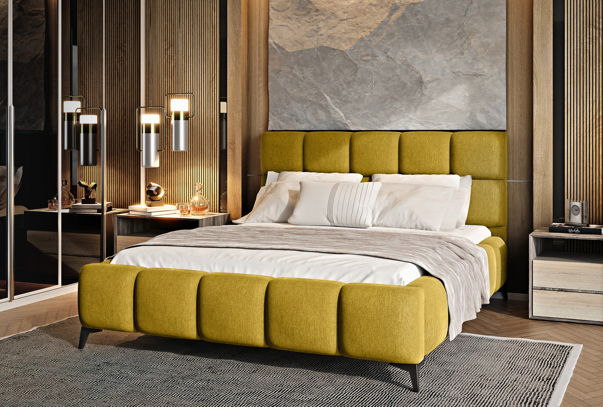 Posteľ Mist je kombináciou moderného dizajnu a glamour štýlu, ktorá prináša nádych elegancie do každej spálne. Opierka hlavy má mäkkú penovú výplň potiahnutú vysoko kvalitným čalúnením. Prešívanie, ktoré zdobí posteľ Mist, pridáva štýl a charakter a prináša nádych modernosti.Nábytok je k dispozícii v troch šírkach spacie plochy: 140, 160, 180 x 200 centimetrov. To uľahčuje prispôsobenie postele podmienkam v byte. Čierne oceľové nohy s dĺžkou až 13.5 centimetrov vytvára dojem, že posteľ sa vznáša nad zemou, čo ďalej opticky zväčšuje miestnosť, v ktorej bude posteľ Mist umiestnená. Okrem toho je nábytok tiež vybavený úložným priestorom na posteľnú bielizeň, čo je veľmi dobré riešenie pre malé priestory a umožňuje udržiavať spálňu upratanú.