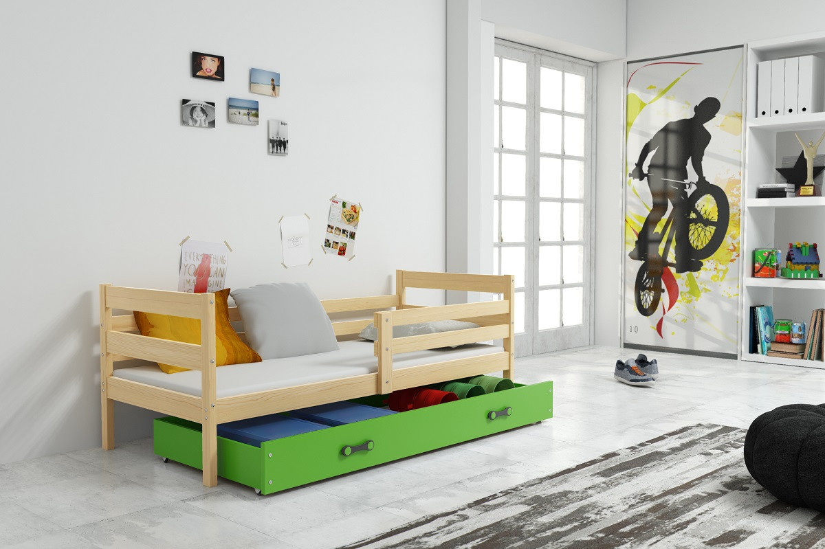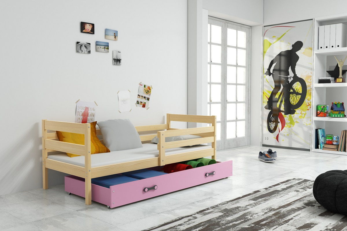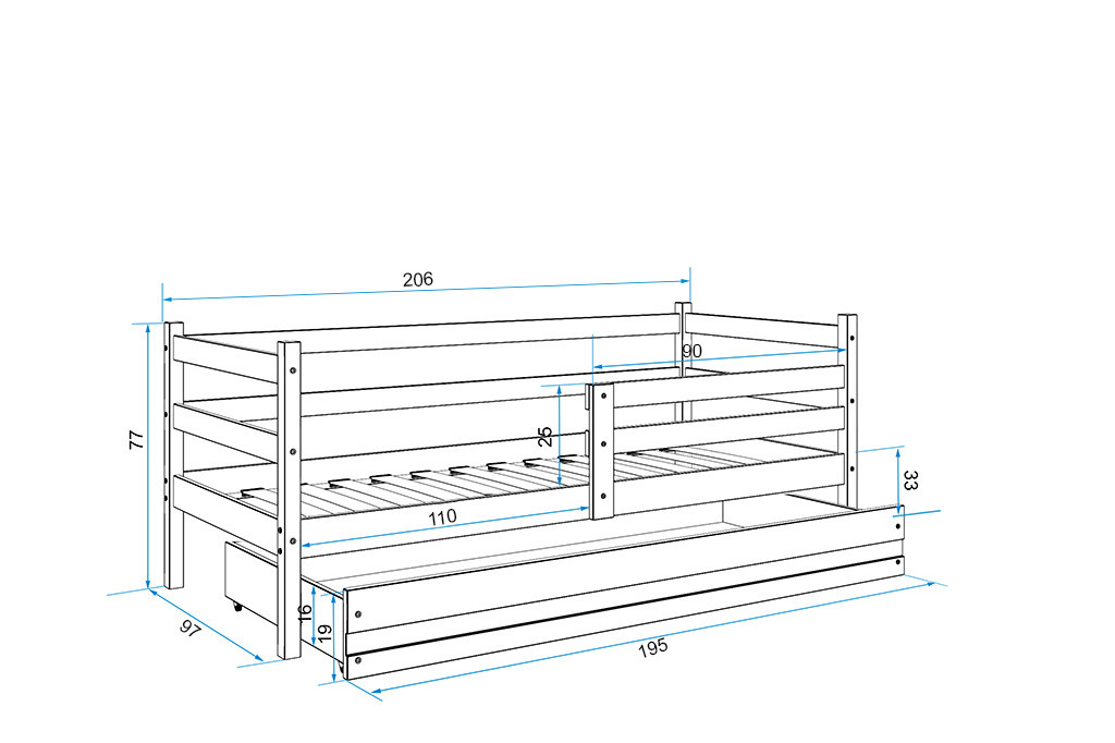 Detská posteľ Norbert je určená pre tých, ktorí hľadajú pre svoje dieťa funkčnosť a kvalitu. Posteľ je vyrobená z borovicového dreva, ktoré je trikrát lakované, aby sa zabezpečila čistota a farebná stálosť. Na lakovanie sa používa bezpečný lak na vodnej báze, ktorý spĺňa normy. Stabilná konštrukcia, zaoblené hrany a zábrana, ktorá je v cene postele, zaisťujú bezpečnosť a pohodlie dieťaťa. Zábranu môžete podľa potreby umiestniť na pravú alebo ľavú stranu postele. Súčasťou postele je aj praktický úložný priestor na kolieskach, rošt a penový matrac so snímateľným poťahom. Hrúbka matraca je 7 cm. Plocha na spanie je 90x200 cm. Posteľ sa dodáva v demontovanom stave a obsahuje montážny plán vrátane všetkých potrebných spojovacích prvkov. Zobrazené dekorácie nie sú zahrnuté v cene. Zobrazenie farieb na fotografii sa môže mierne líšiť od skutočnej farby.