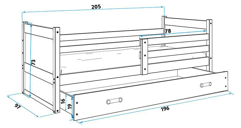 Detská posteľ Riky je určená pre tých, ktorí pre svoje dieťa hľadajú funkčnosť, moderný dizajn a kvalitu. Posteľ je vyrobená z borovicového dreva v kombinácii s MDF doskami (farebné panely na bokoch postele). Stabilná konštrukcia, zaoblené hrany a zábrana, ktorá je v cene postele, zaisťujú bezpečnosť a pohodlie dieťaťa. Zábranu môžete podľa potreby umiestniť na pravú alebo ľavú stranu postele. Súčasťou postele je aj praktický úložný priestor na kolieskach, rošt a penový matrac so snímateľným poťahom. Hrúbka matraca je 7 cm. plocha na spanie je 90x200 cm. Posteľ sa dodáva v demontovanom stave a obsahuje montážny plán vrátane všetkých potrebných spojovacích prvkov. Zobrazené dekorácie nie sú zahrnuté v cene. Zobrazenie farieb na fotografii sa môže mierne líšiť od skutočnej farby.