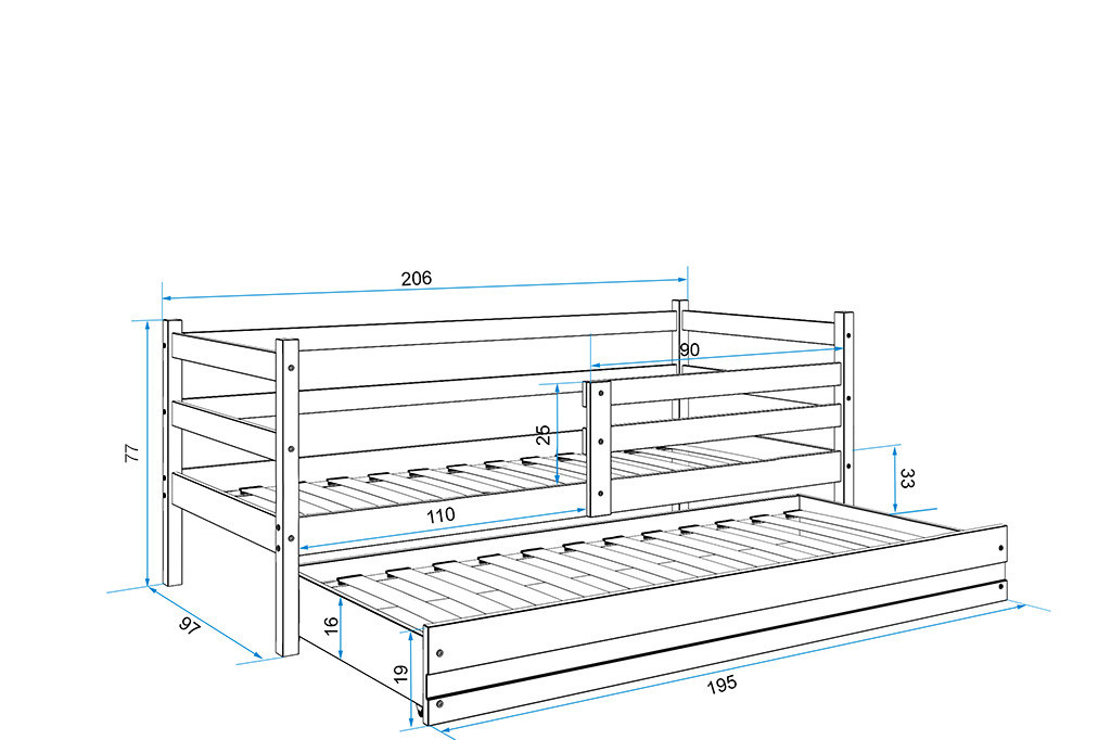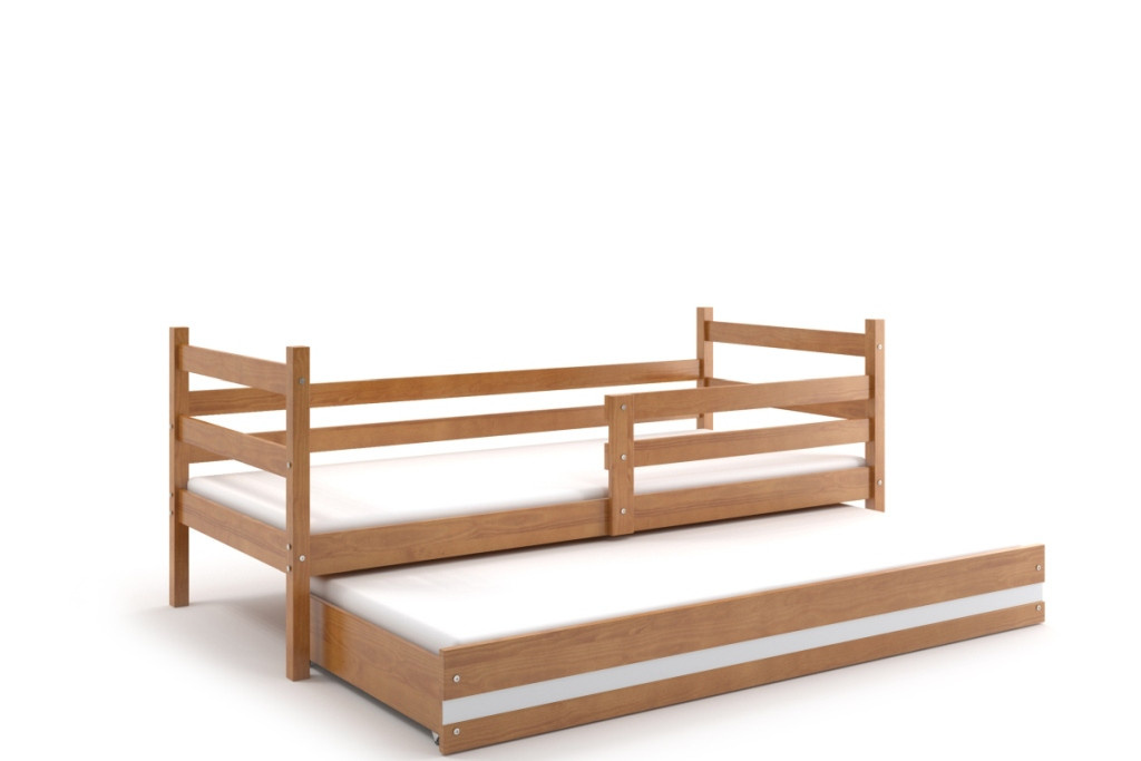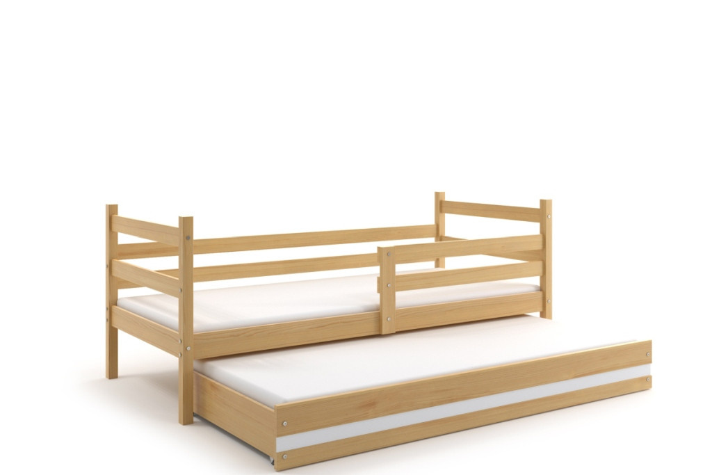 Detská posteľ Norbert II je určená pre tých, ktorí pre svoje dieťa hľadajú funkčnosť, pohodlie a kvalitu. Posteľ je vyrobená z borovicového dreva. Jej stabilná konštrukcia, zaoblené hrany a zábrana, ktorá je v cene postele, zabezpečujú bezpečnosť a pohodlie dieťaťa. Zábranu si môžete podľa potreby umiestniť na pravú, alebo ľavú stranu postele. Súčasťou postele je aj praktická prístelka s matracom, ktorú môžete využiť pre druhé dieťa, alebo keď u Vášho dieťaťa bude chcieť prespať kamarát/ka. Obe časti postele majú rošt a penovú matrac so snímateľným poťahom. Hrúbka matraca je 7 cm. Plocha na spanie je 90x200 cm (vrchná časť) a 80x190 cm (prístelka). Posteľ je dodávaná v demonte a súčasťou je montážny plánik vrátane všetkých potrebných spojovacích materiálov. Zobrazené dekorácie nie sú v cene.