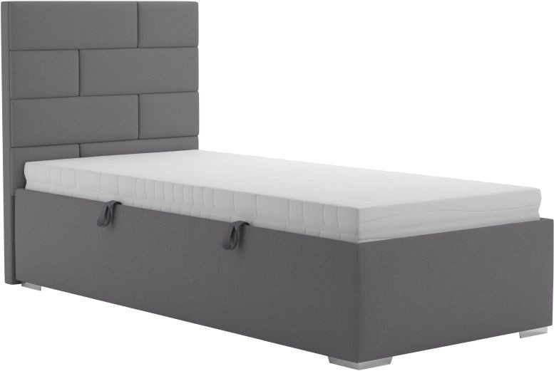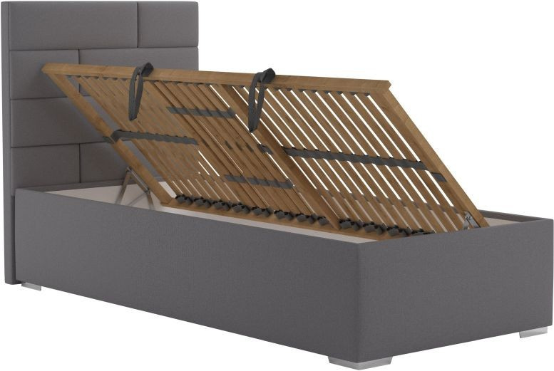 Moderná posteľ, ktorá sa hodí nielen do študentských alebo detských izieb, ale aj do menších spální. Základom lôžka je pevný lamelový rošt s nastavením tuhosti lamiel a s popruhom proti preťaženiu. Rošt sa skladá z 28 lamiel uložených vo výkyvných kaučukových puzdrách. Jednoduchšiu manipuláciu pri otváraní úložného priestoru zabezpečujú pružinové mechanizmy. Matrac nie je súčasťou postele. Súčasťou postele je úložný priestor, ktorý sa otvára z boku postele. Túto posteľ ponúkame aj v ďalších rozmeroch. Posteľ je možné zakúpiť aj s matracom. Tovar je dodávaný v demonte.