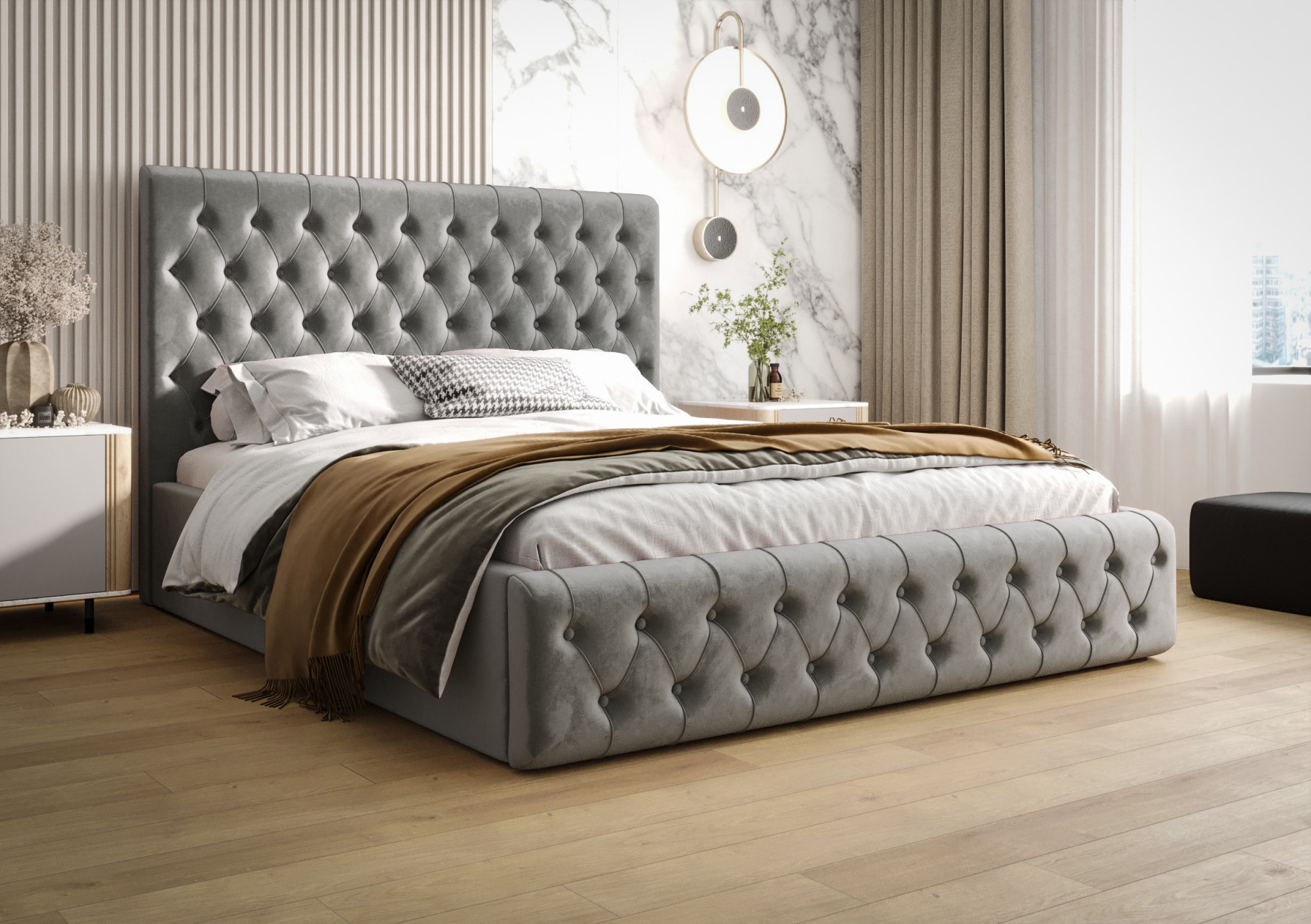 Čalúnená posteľ Valentino je ideálnym modelom pre fanúšikov štýlu glamour. Celok dopĺňa ozdobné prešívané čelo a úložný priestor na posteľnú bielizeň.