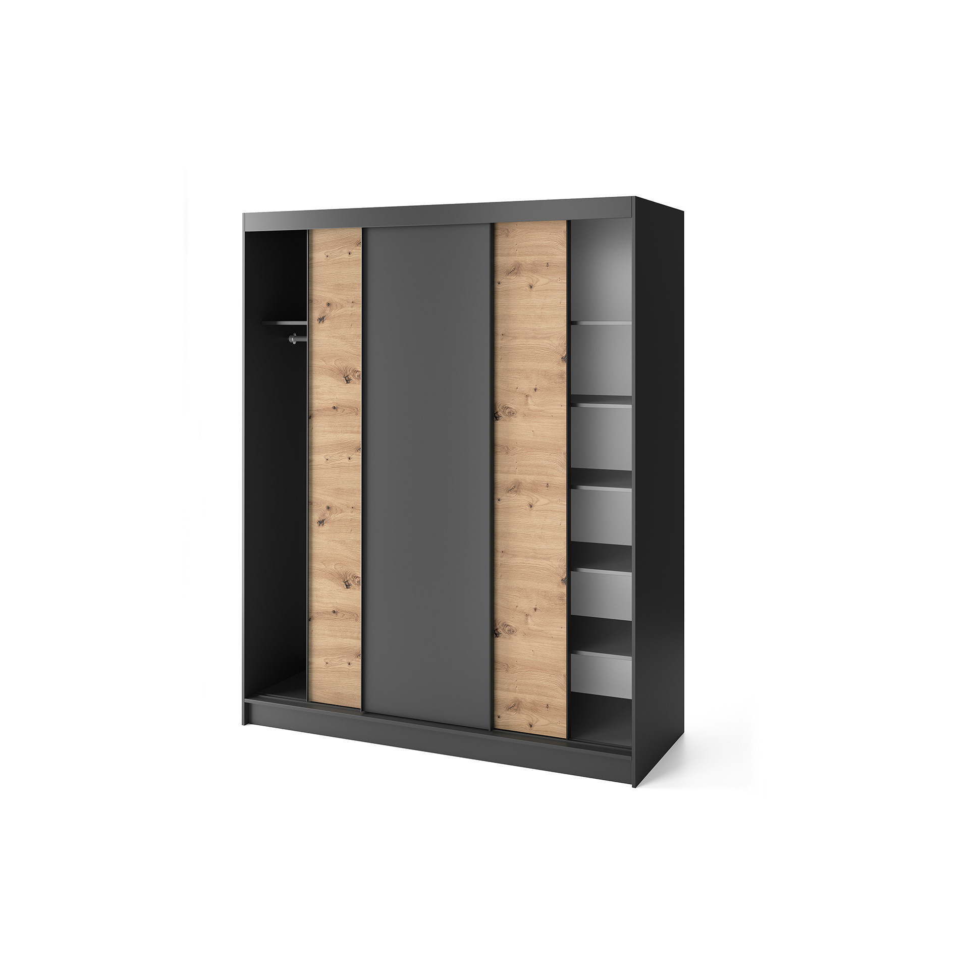 Šatní skriňa Esville s posuvnými dverami, s hĺbkou 60 cm, šírkou 180 cm a výškou 220 cm, dostupná v farbe dub artisan/matná čierna, je praktickým a elegantným riešením pre úložný priestor. Jeho pevná konštrukcia a precízne spracovanie z neho robia ideálny doplnok do vášho interiéru. Šatní skriňa je navrhnutá s ohľadom na optimálne využitie priestoru. Jeho interiér obsahuje 6 políc, z ktorých každá unesie záťaž až 10 kg, čo umožňuje usporiadané uloženie rôznych predmetov. Navyše priložené tyče umožňujú zavesenie oblečenia, čo ďalej uľahčuje organizáciu. Vyrobená z 16 mm hrubej MDF dosky, skriňa ponúka pevnú konštrukciu, pričom ABS hrany ju chránia pred poškodením a dodávajú eleganciu celkovému vzhľadu. Nula.5 cm vysoké nohy, vyrobené z odolného syntetického materiálu s čiernou povrchovou úpravou, zabezpečujú stabilné umiestnenie a jednoduchú manévrovateľnosť. Šatní skriňa Esville ponúka tri posuvné dvere, ktoré umožňujú pohodlné otváranie a zatváranie, bez toho aby zaberali ďalší priestor v miestnosti. Tento dizajn je tiež ideálnou voľbou pre menšie priestory. Farebná schéma šatníka v tónoch remeselného duba a matnej čiernej mu dodáva moderný vzhľad, ktorý dobre ladí s rôznymi štýlmi interiéru. Okrem toho je tu možnosť voľby medzi verziou so zrkadlom a bez neho, čo umožňuje prispôsobenie podľa vašich preferencií. Stručne povedané, šatníková skriňa s posuvnými dverami Esville o rozmeroch 60 cm hĺbka, 180 cm šírka a 220 cm výška je funkčný a štýlový prvok nábytku, ktorý vám poskytne praktické úložné priestory a zároveň pridá eleganciu a estetiku vášmu interiéru.
