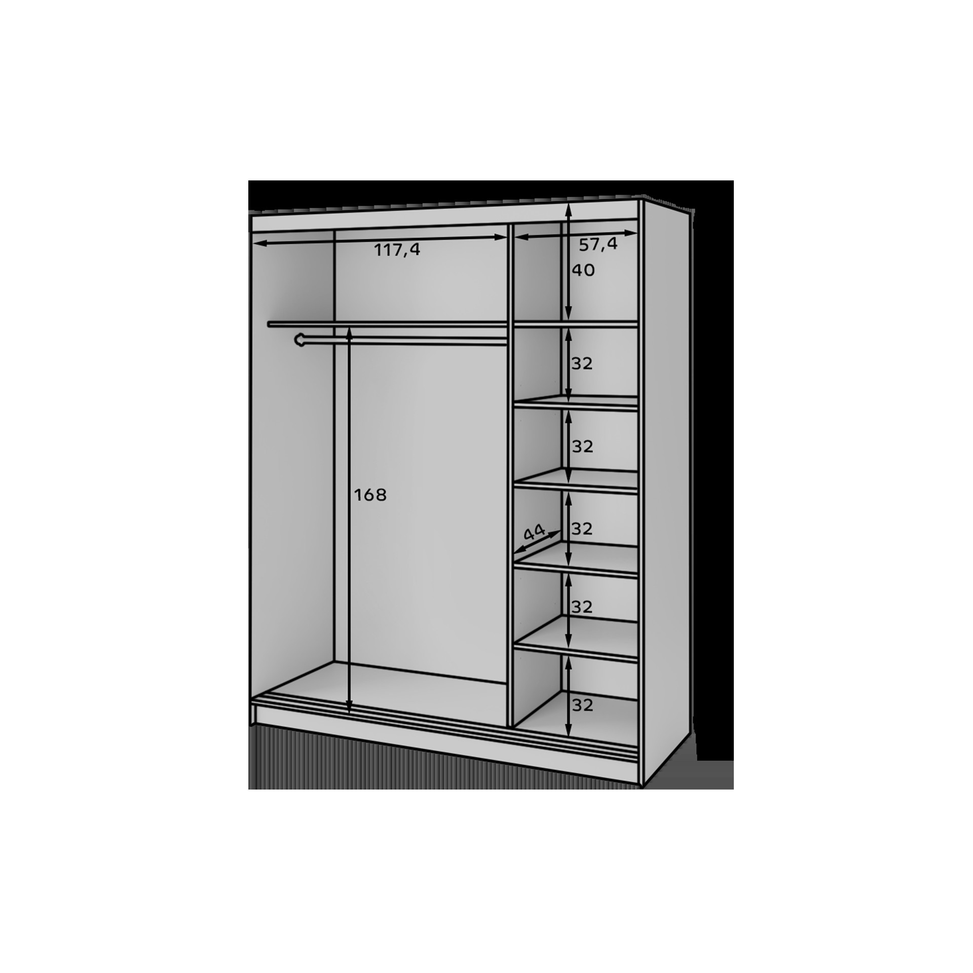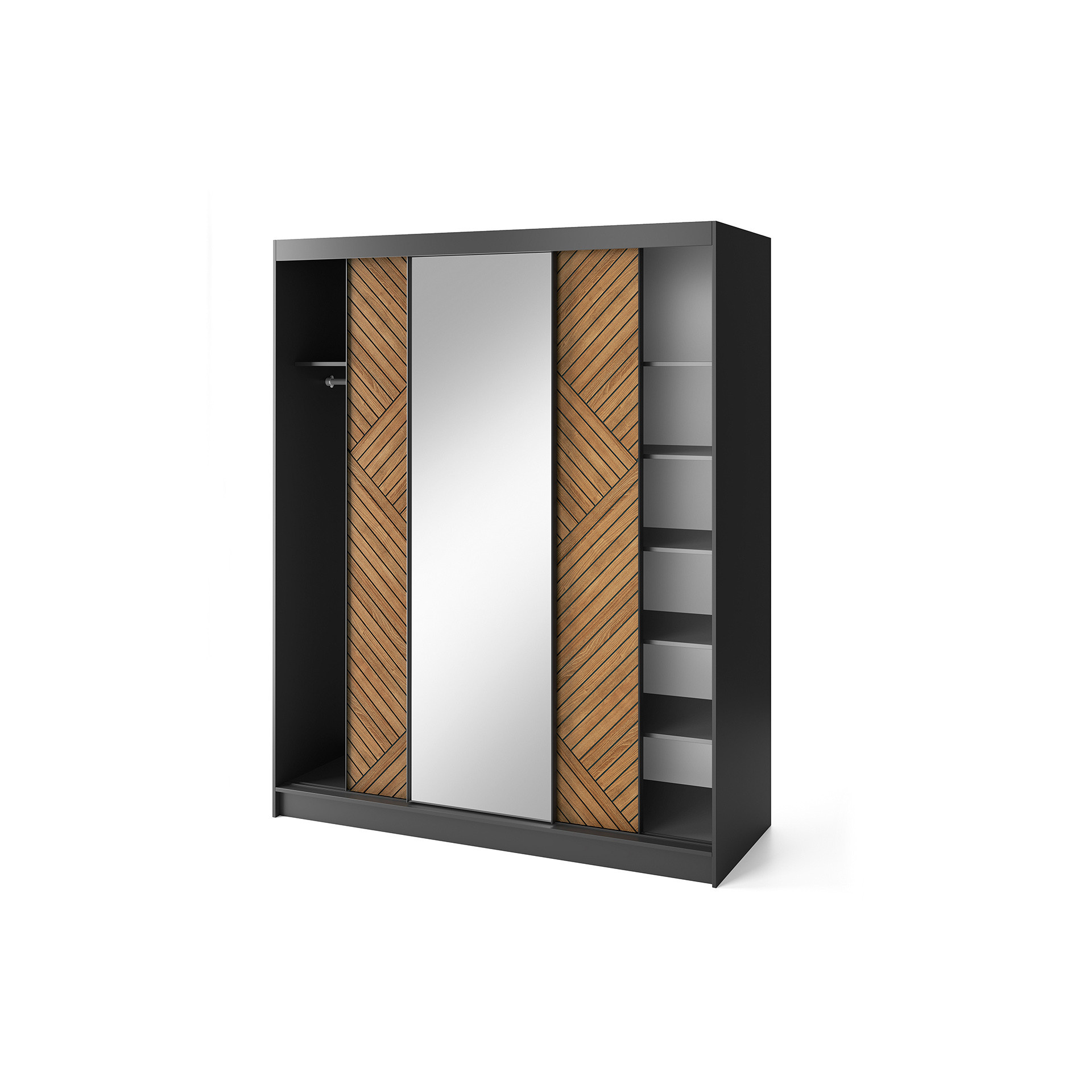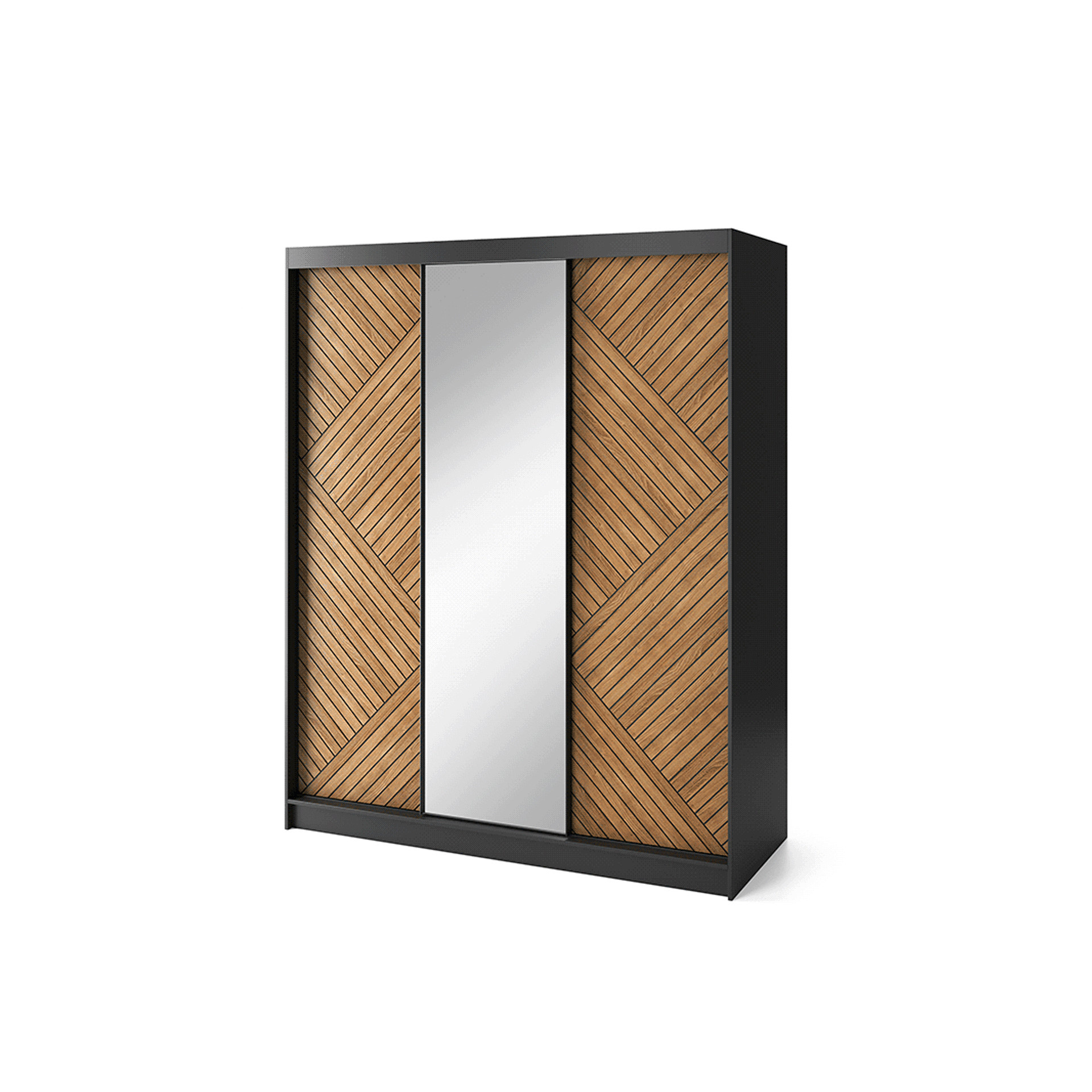 Posuvná skriňa Marrphy so zrkadlom v sade, s hĺbkou 60 cm, šírkou 180 cm a výškou 220 cm, je praktickým a elegantným riešením pre ukladanie vecí. Jeho farebná paleta v odtieňoch karamelového duba a čiernej dodáva interiéru moderný charakter. Maximálna nosnosť police 10 kg zabezpečuje bezpečné uloženie rôznych predmetov. Nula.5 cm vysoké plastové nohy, vybavené čierne tónovaným klzákom, zabezpečujú stabilitu a plynulý pohyb skrine. Telo šatníkovej skrine je vyrobené z MDF dosky o hrúbke 16 mm s ABS hranou, čo zaisťuje odolnosť a estetický vzhľad. Sada obsahuje tyče a šesť políc, čo umožňuje organizované skladovanie. Šatní skriňa má tri posuvné dvere so zrkadlami, čo efektívne využíva dostupný priestor. Vďaka harmonickému spojeniu funkčnosti a estetiky sa táto šatníková skriňa stáva nevyhnutným prvkom v každej miestnosti.