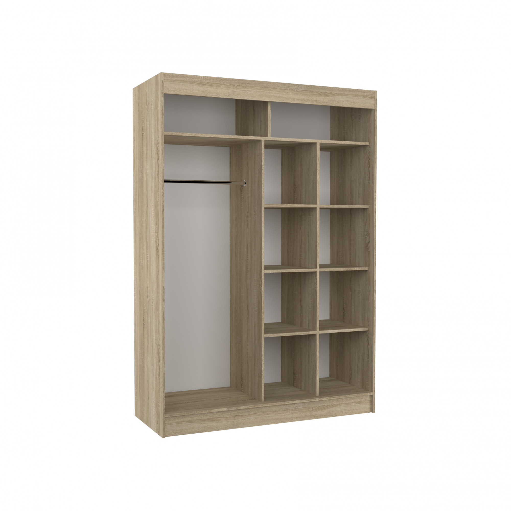 Posuvná skriňa KAREN je ideálnym spôsobom, ako usporiadať priestor. Nábytok je vybavený priestrannými policami a tyčou, na ktorú môžete zavesiť šaty, obleky, vrchné odevy alebo košele. Na čelnej strane sa nachádzajú ozdobné lacobely, ktoré dodávajú nábytku výnimočný štýl. Vďaka tomu, že skriňa je posuvná, nemusíte vyčleňovať ďalšie miesto na otvorenie dverí, čo z nej robí ideálne riešenie pre malú izbu alebo úzku predsieň.