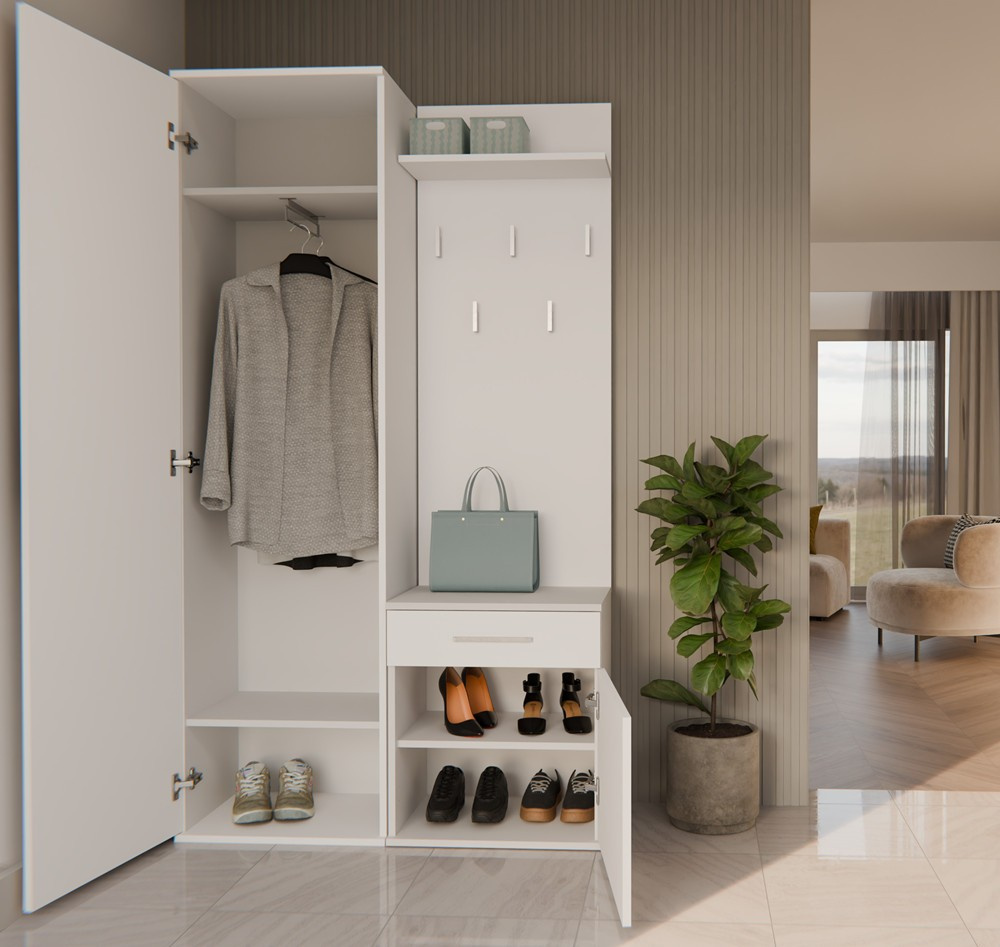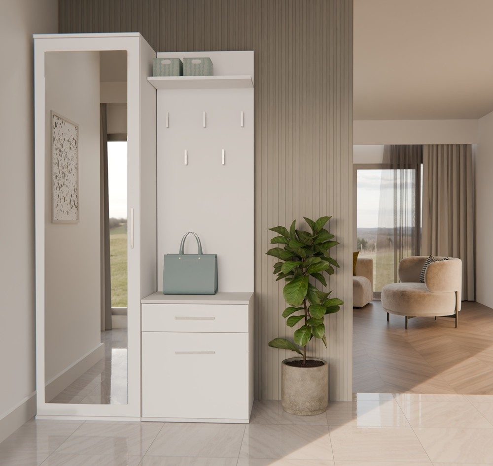 Predsieňová zostava Topaz v modernom štýle a trendových farbách splní očakávania všetkých, ktorí ocenia kombináciu jednoduchosti a elegancie. Skladá sa zo zrkadlovej skrine a predsieňovej steny s praktickou zásuvkou a menšou skrinkou s možnosťou montáže dvierok na ľavej alebo pravej strane. Je vyrobená z laminátu, ktorý sa ľahko udržiava, a jej hrany sú upravené vysoko odolným materiálom ABS.