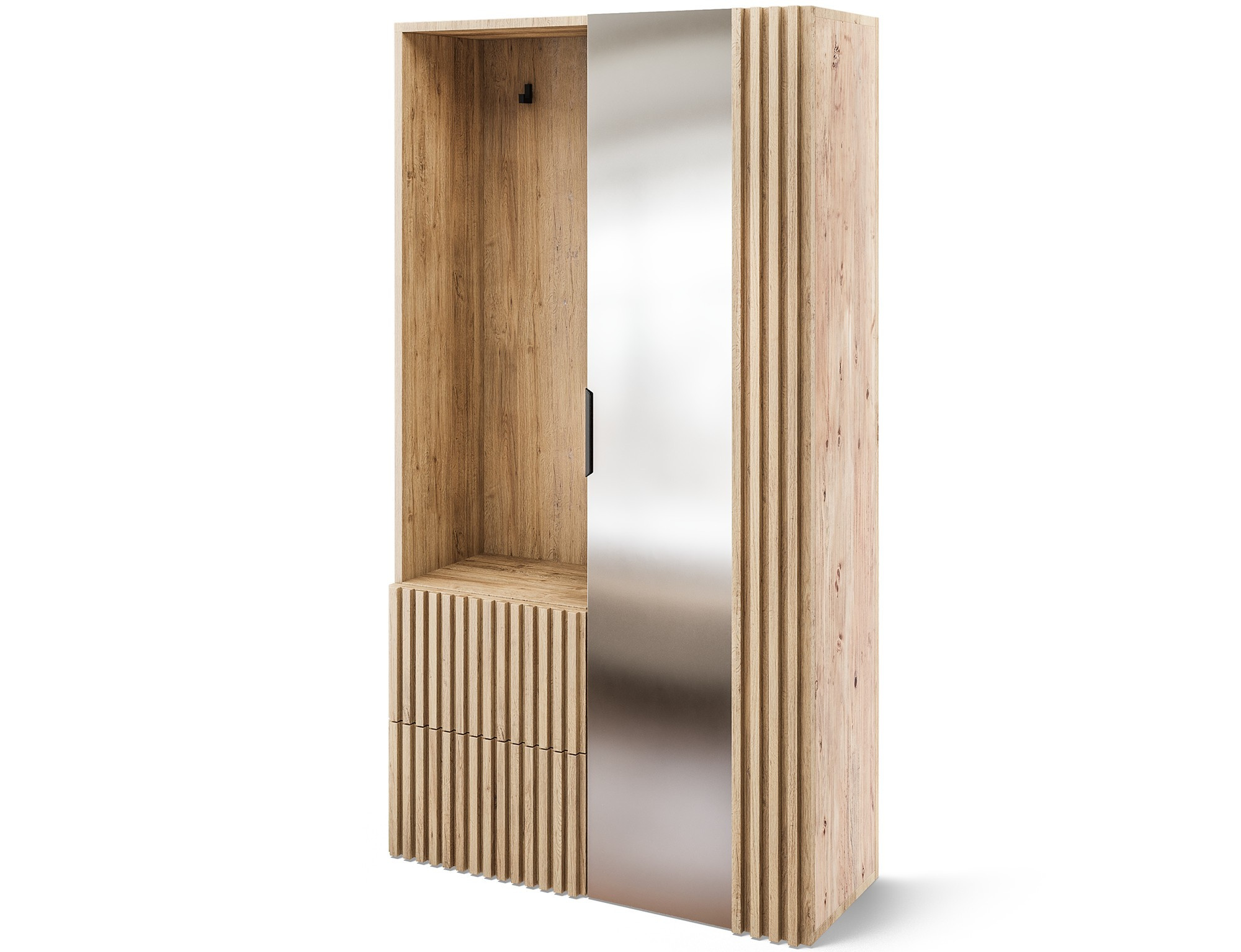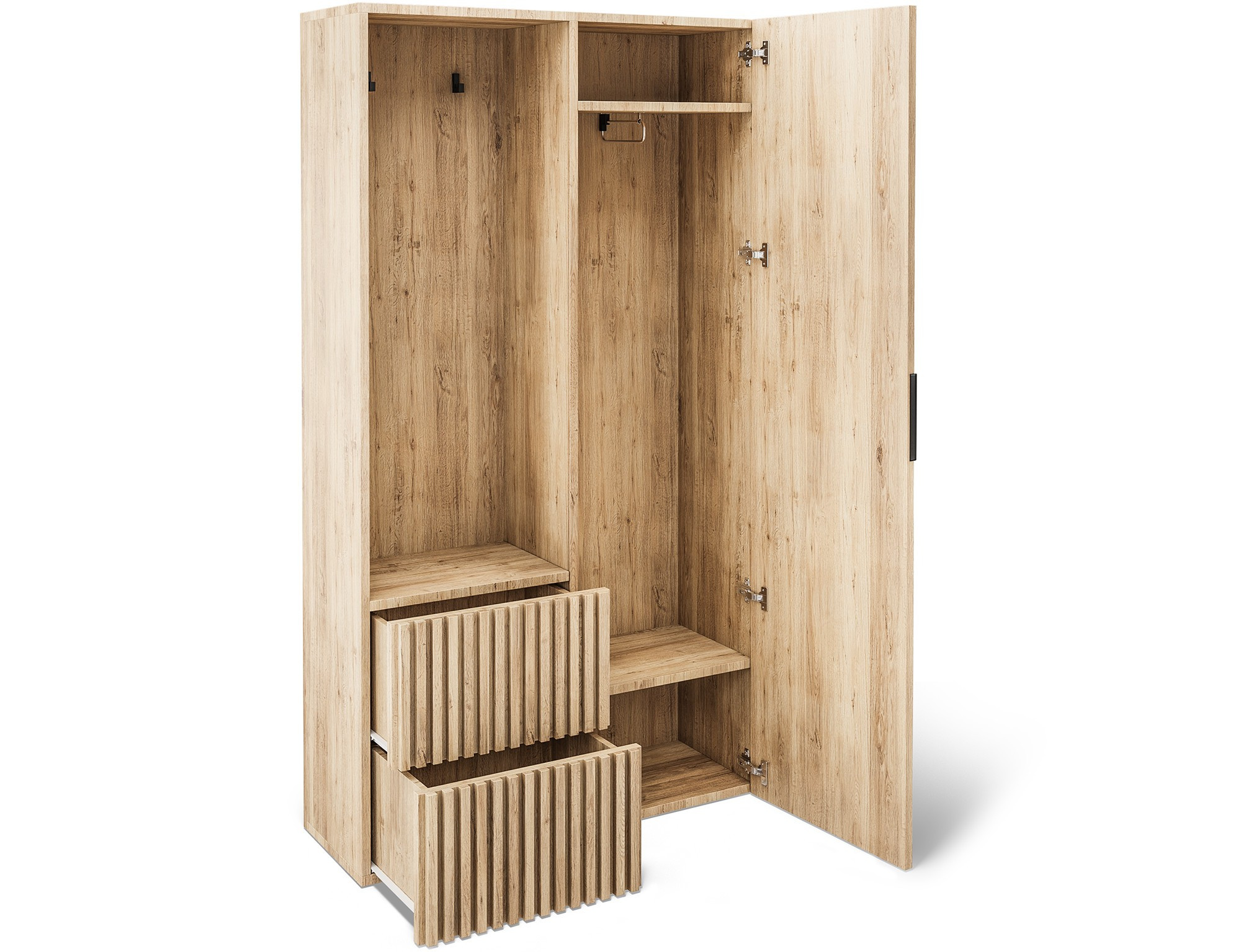 Šatní skriňa Vimeiro je funkčný, kompaktný kus nábytku pre chodbu, spálňu alebo šatník, ktorý uľahčuje každodennú organizáciu; s rozmermi 180 × 100 × 35 cm ponúka praktickú závesnú tyč, 2 police s nosnosťou až 20 kg každá a 2 priestranné zásuvky (až 10 kg každá), takže môžete úhľadne uložiť kabáty, bundy, topánky a doplnky.
