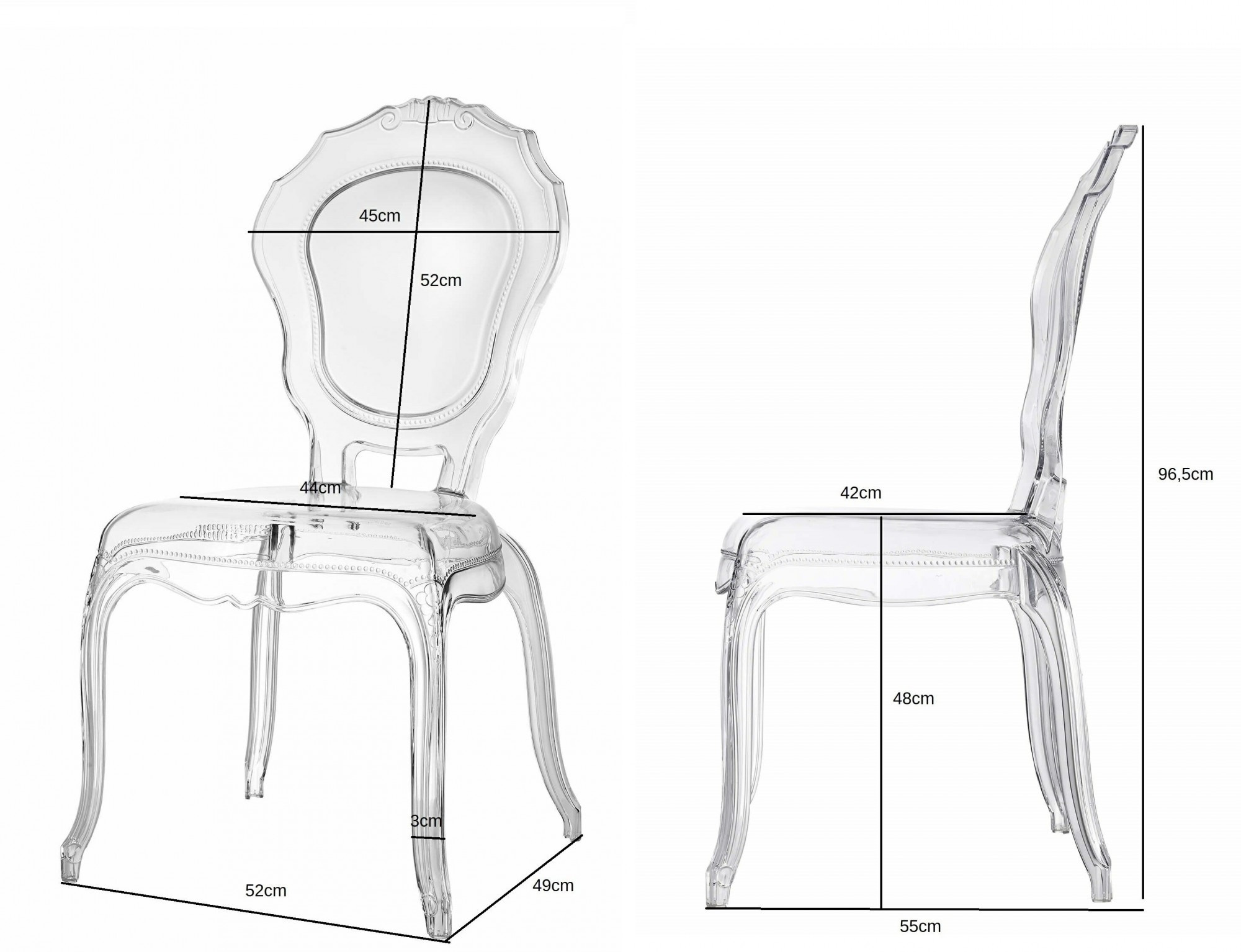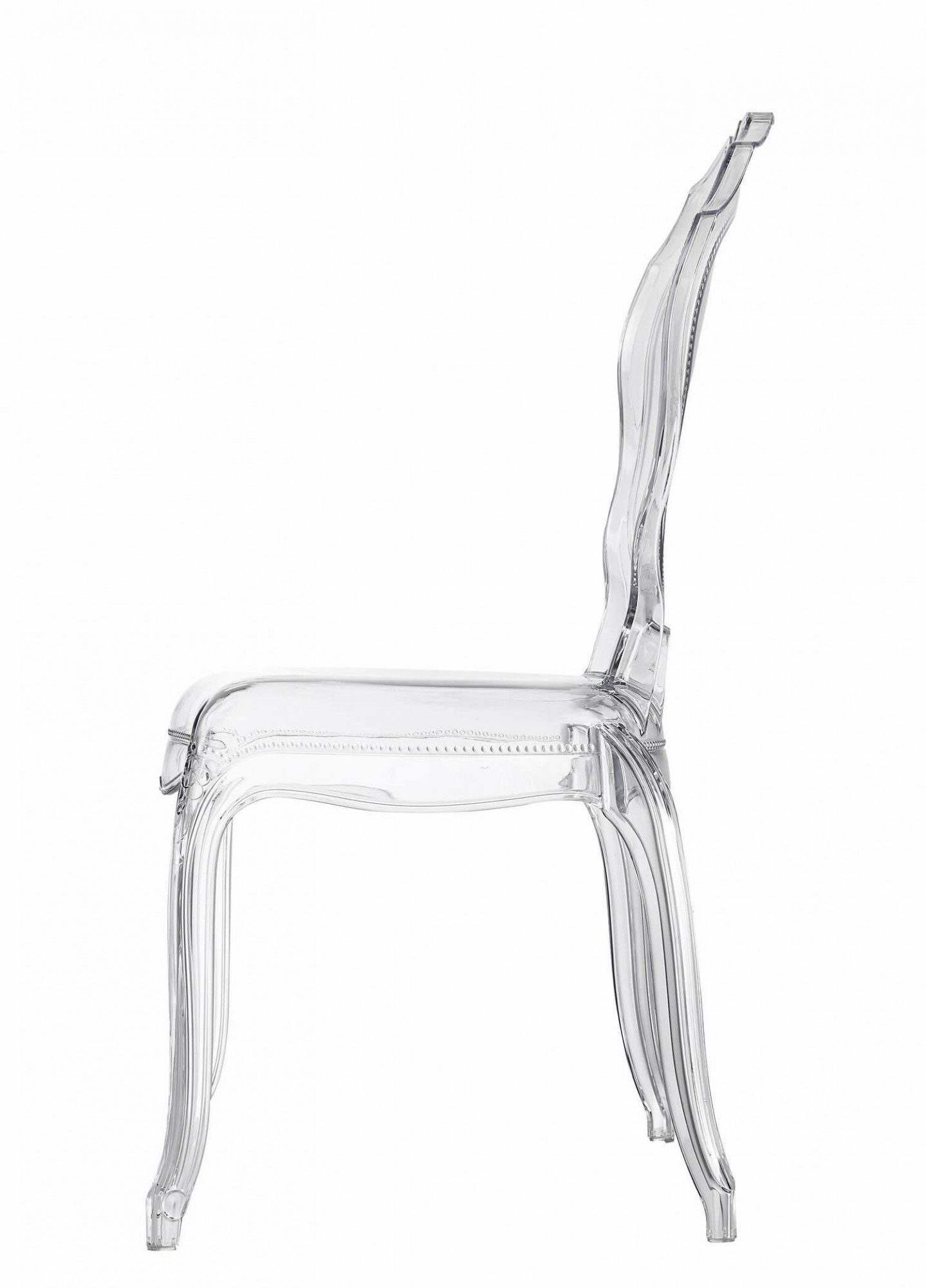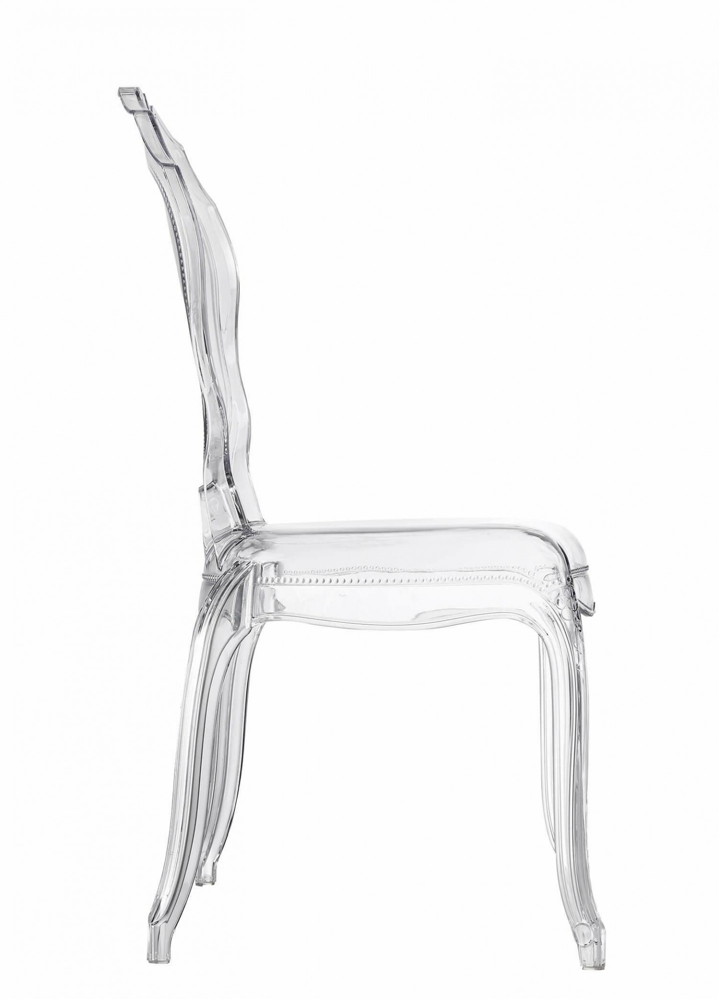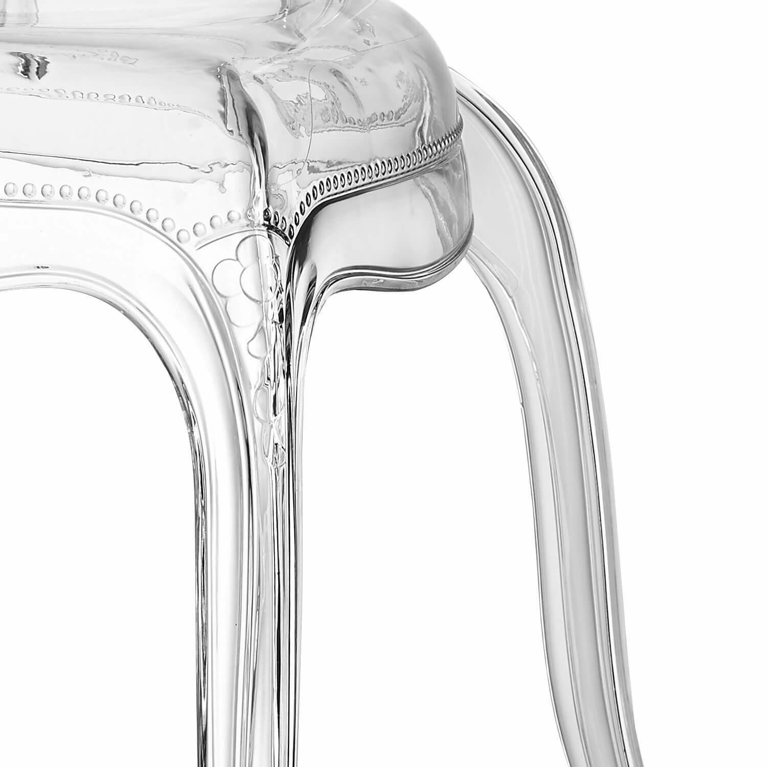 Moderná transparentná stolička Queen je dokonalá forma uzavretá v úžitkovom nábytku. Transparentná stolička Queen je vyrobená z materiálu s lesklou povrchovou úpravou, čo zaručuje, že jej údržba v čistote nebude predstavovať žiadny problém. Stolička bola vyrobená v štýle Glamour. Ozdobné zakončenie na základni stoličky aj na hornej časti jej sedadla robí stoličku mimoriadne dizajnovou a modernou. Priehľadná stolička Queen sa skvele hodí ako stolička pre rôzne slávnostné príležitosti, stolička do jedálne alebo stolička k písaciemu stolu. Stoličky je možné stohovať, n