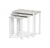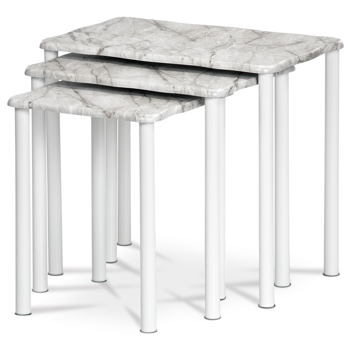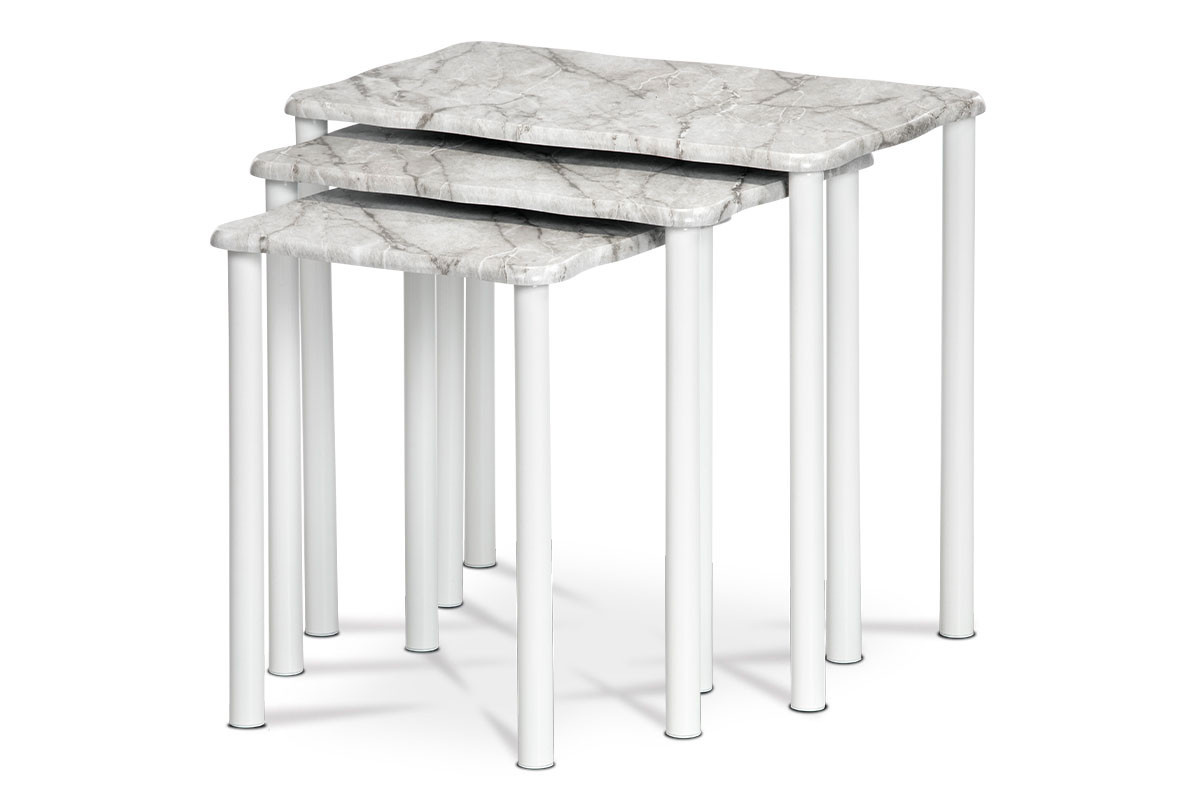 Súprava 3 odkladacích a prístavných stolíkov. Doska je vyrobená z hrubej MDF. 1 cm zo sivého a bieleho mramoru, stabilné a pevné nohy sú vyrobené z kovových rúrok s priemerom 2,5 cm, natretých bielou práškovou farbou. Sú zakončené plastovými klzákmi, ktoré zabraňujú poškodeniu podlahovej krytiny pri manipulácii. Stolové dosky majú zaoblené rohy, polkruhovú fazetu po obvode a zvlnené hrany, ktoré dokonale imitujú mramor. Nosnosť každého stola je 3 kg. Štýlovo zapadá do klasicky zariadených interiérov. Ako solitér sa stoly dajú použiť v akomkoľvek interiéri, či už obytnom alebo komerčnom. Na stolíky môžete elegantne umiestniť lampu, kvety, sochy alebo ich využiť ako odkladací priestor na kávu či pohár vína pri relaxácii v kresle. To nie je jediná vec, ktorú vám táto súprava poslúži.