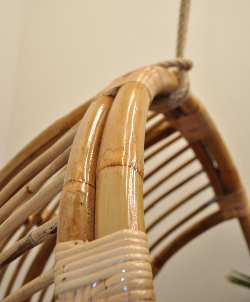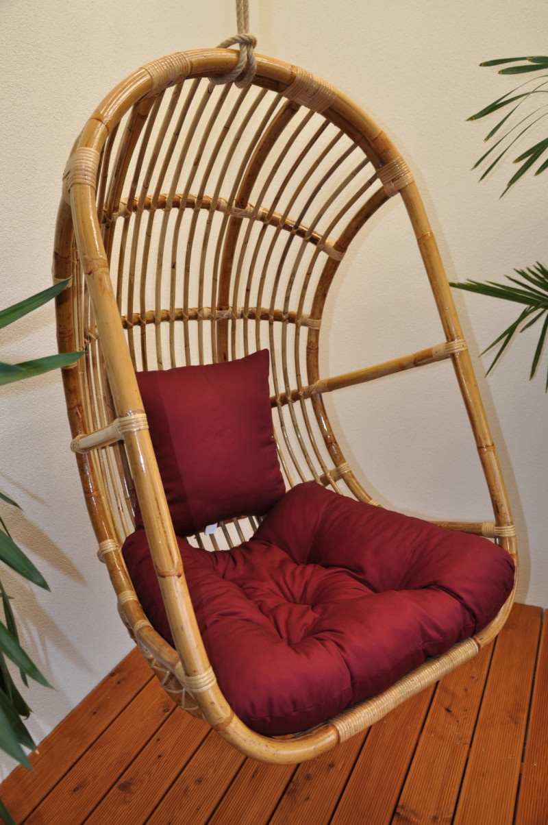 Ratanová závesná hojdačka z masívneho prírodného ratanu semambo. | Hojdačka je vyrobená z prírodného ratanu Semambo, ktorý sa vyznačuje vysokou pevnosťou a odolnosťou. V hornej časti hojdačky sa používajú dvojité ratanové tyče na zvýšenie pevnosti. Rozmery hojdačky sú 80x118x85 cm. Nosnosť hojdačky je 100 kg. Závesná hojdačka sa dodáva s kvalitnými vankúšmi, ktoré sú vyrobené v Českej republike. Podložky je možné prať pri 40 °C. Súčasťou balenia je aj pevné lano na zavesenie.