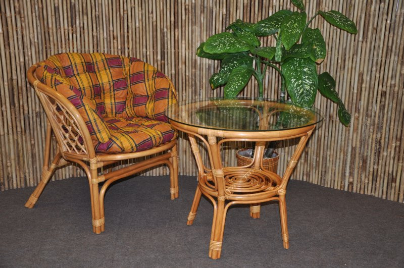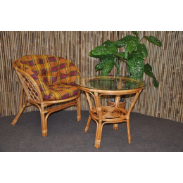 Ratanová sedacia súprava je vyrobená z prírodného ratanu s farbou konštrukcie zodpovedajúcou fotografii výrobku, obsahuje 1 kreslo a stolík so sklom, vankúše sú vyrobené v ČESKEJ REPUBLIKE. | Farba konštrukcie je medová, rozmery kresla sú 68x66x73 cm, výška sedadla je 44 cm, výška stola je 55 cm, priemer stola je 60 cm, nosnosť kresla je 110 kg. Spoje konštrukcie sú skrutkované.Vankúšiky sa môžu prať ručne pri 40 °C alebo čistiť v čistiarni