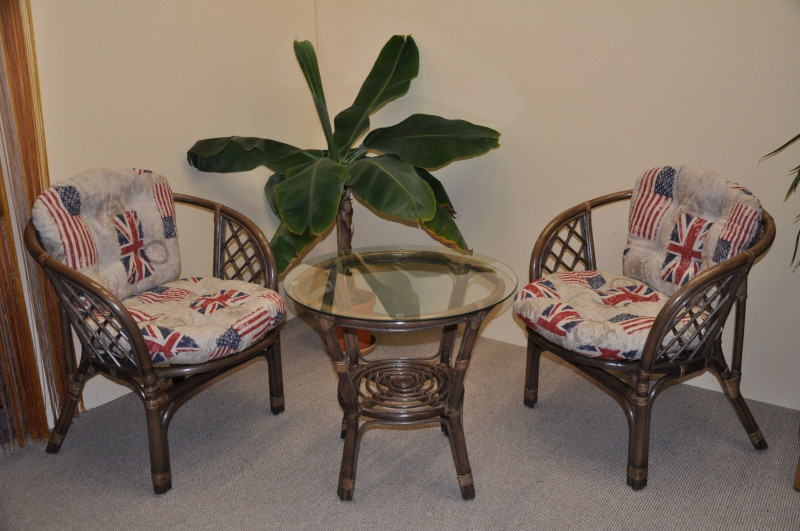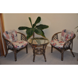 Ratanová sedacia súprava Bahama pozostáva z dvoch kresiel, stolíka so sklenenou doskou a kompletnej sady vankúšov. | Farba ratanovej konštrukcie je hnedá. Konštrukčným materiálom je prírodný ratan. Rozmery stoličky bahama sú 68x66x73 cm, výška sedadla je 44 cm, nosnosť stoličky je 110 kg. Výška stola je 55 cm, priemer stola je 60 cm. Spoje ratanovej konštrukcie sú skrutkované. Vankúše sú vyrobené v Českej republike a možno ich prať ručne pri teplote 40 °C alebo čistiť v čistiarni.