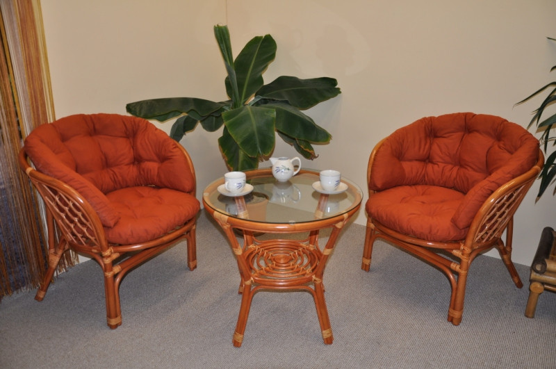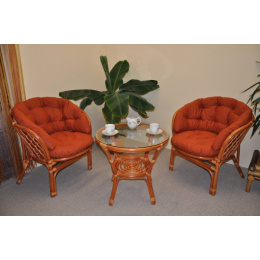 Ratanová sedacia súprava Bahama pozostáva z dvoch kresiel, stolíka so sklenenou doskou a kompletnej sady vankúšov v dizajne MAXI. | Farba ratanovej konštrukcie je koňaková. Konštrukčným materiálom je prírodný ratan. Rozmery stoličky bahama sú 68x66x73 cm, výška sedadla je 44 cm, nosnosť stoličky je 110 kg. Výška stola je 55 cm, priemer stola je 60 cm. Spoje ratanovej konštrukcie sú skrutkované. Vankúše sú vyrobené v Českej republike a možno ich prať ručne pri teplote 40 °C alebo čistiť v čistiarni.