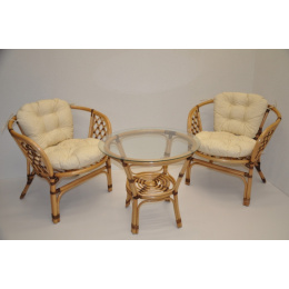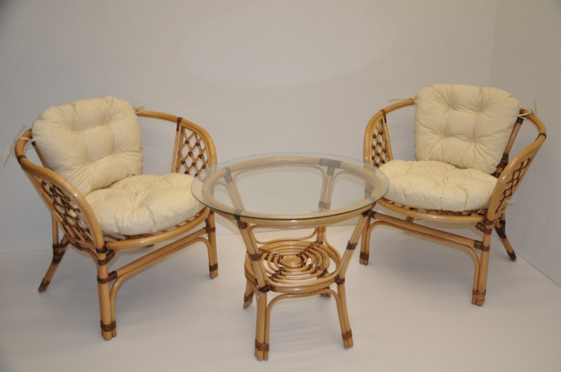 Pohovka Bahama je stále jednou z najobľúbenejších ratanových pohoviek. Súprava sa skladá z dvoch kresiel, stola so sklenenou doskou a kompletnej sady vankúšov. | Prinášame vám obľúbenú sedacie súpravu v nezvyčajnom dizajne, ktorý dodáva sedacej súprave Bahama úplne jedinečný vzhľad. Farba ratanovej konštrukcie je medová. Opletanie konštrukčných spojov je hnedej farby. Konštrukčným materiálom je prírodný ratan. Rozmery stoličky sú 68x66x73 cm, výška sedadla je 44 cm, nosnosť stoličky je 110 kg. Výška stola je 55 cm, priemer stola je 65 cm. Spoje ratanovej konštrukcie sú skrutkované. Vankúše tejto pohovky sú vyrobené v Českej republike. Vankúše sú vyrobené z kvalitnej tkaniny a vyznačujú sa vysokou kvalitou spracovania.Polstre pre nás vyrába spoločnosť AXIN Cuschions s.r.o., ktorá zamestnáva výlučne miestne vyučené krajčírky z Českej republiky. Týmto spôsobom sa budeme snažiť podporiť výrobu a zamestnanosť v našej krajine. Výplň vankúšov je z drvenej peny a vankúše sa môžu prať ručne pri 40 °C.