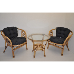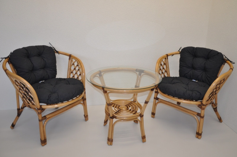 Pohovka Bahama je stále jednou z najobľúbenejších ratanových pohoviek. Súprava sa skladá z dvoch kresiel, stola so sklenenou doskou a kompletnej sady vankúšov. | Prinášame vám obľúbenú sedacie súpravu v nezvyčajnom dizajne, ktorý dodáva sedacej súprave Bahama úplne jedinečný vzhľad. Farba ratanovej konštrukcie je medová. Opletanie konštrukčných spojov je hnedej farby. Konštrukčným materiálom je prírodný ratan. Rozmery stoličky sú 68x66x73 cm, výška sedadla je 44 cm, nosnosť stoličky je 110 kg. Výška stola je 55 cm, priemer stola je 65 cm. Spoje ratanovej konštrukcie sú skrutkované. Vankúše tejto pohovky sú vyrobené v Českej republike. Vankúše sú vyrobené z kvalitnej tkaniny a vyznačujú sa vysokou kvalitou spracovania.Polstre pre nás vyrába spoločnosť AXIN Cuschions s.r.o., ktorá zamestnáva výlučne miestne vyučené krajčírky z Českej republiky. Týmto spôsobom sa budeme snažiť podporiť výrobu a zamestnanosť v našej krajine. Výplň vankúšov je z drvenej peny a vankúše sa môžu prať ručne pri 40 °C.