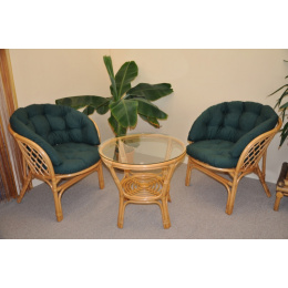 Sedacia súprava Bahama patrí stále medzi najobľúbenejšie ratanové sedacie súpravy. Súprava sa skladá z dvoch kresiel, stolíka so sklenenou doskou a kompletnej sady podušiek. | Farba ratanovej konštrukcie je medová. Materiál konštrukcie je prírodný ratan. Rozmer kresla je 68x66x73 cm, výška sedu 44 cm, nosnosť kresla je 110 kg. Stolík má výšku 55 cm, priemer stolíka 65 cm. Spoje ratanovej konštrukcie sú skrutkované. Polstre na túto sedaciu súpravu Bahama sú vyrobené v Slovenskej republike. Polstre sú vyrobené z kvalitnej látky a vyznačujú sa vysokou kvalitou spracovania.Polstre pre nás vyrába firma AXIN Cuschions s.r.o., ktorá zamestnáva výhradne miestne vyučené krajčírky zo Slovenskej republiky. Týmto spôsobom sa snažíme podporovať výrobu a zamestnanosť v našej republike. Náplň podušiek je drvený molitan a podušky je možné prať ručne na 40o C.