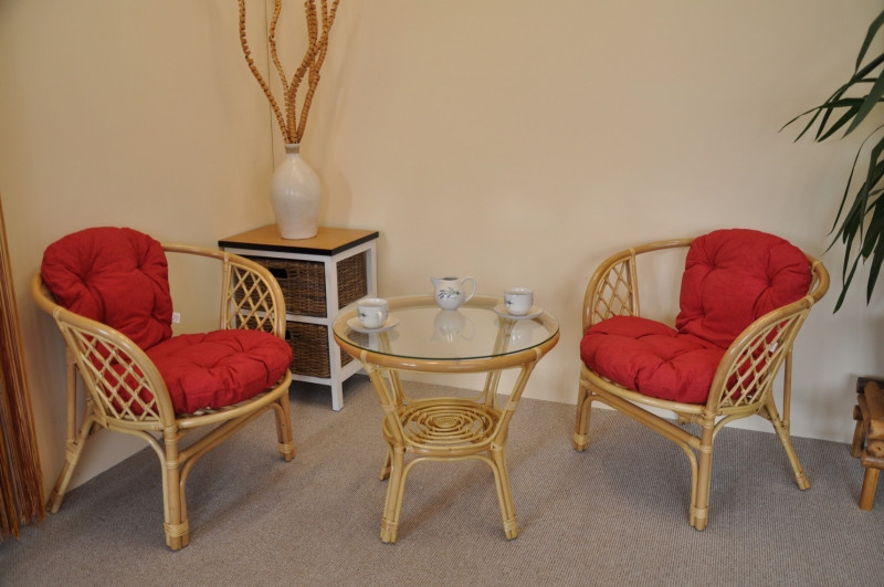 Sedacia súprava Bahama patrí stále medzi najobľúbenejšie ratanové sedacie súpravy. Súprava sa skladá z dvoch kresiel, stolíka so sklenenou doskou a kompletnej sady podušiek. | Farba ratanovej konštrukcie je medová. Materiál konštrukcie je prírodný ratan. Rozmer kresla je 68x66x73 cm, výška sedu 44 cm, nosnosť kresla je 110 kg. Stolík má výšku 55 cm, priemer stolíka 65 cm. Spoje ratanovej konštrukcie sú skrutkované. Polstre na túto sedaciu súpravu sú vyrobené v Slovenskej republike. Polstre sú vyrobené z kvalitnej látky a vyznačujú sa vysokou kvalitou spracovania.Polstre pre nás vyrába firma AXIN Cuschions s.r.o., ktorá zamestnáva výhradne miestne vyučené krajčírky zo Slovenskej republiky. Týmto spôsobom sa snažíme podporovať výrobu a zamestnanosť v našej republike. Náplň podušiek je drvený molitan a podušky je možné prať ručne na 40o C.