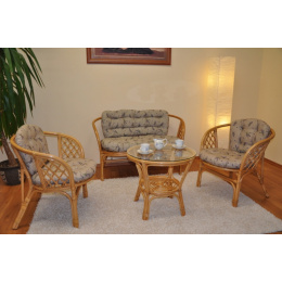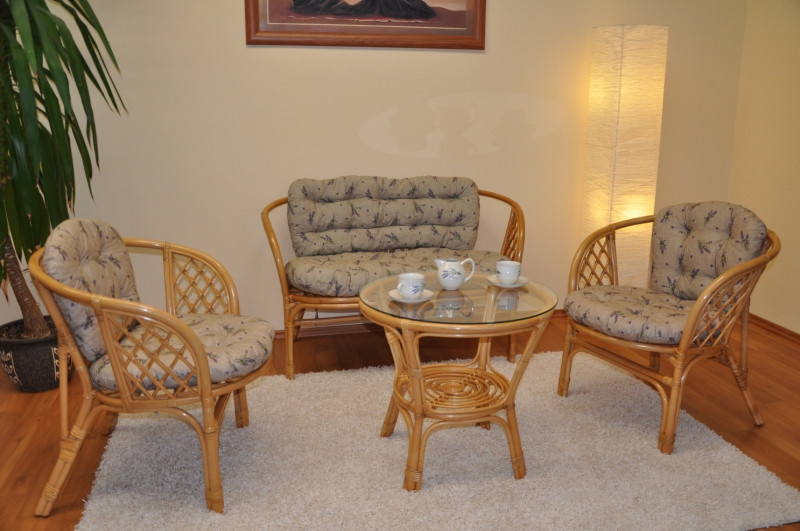 Ratanový nábytok - ratanová pohovka Bahama je vyrobená z prírodného ratanu medovej farby. Súprava obsahuje pohovku, 2 kreslá, stolík so sklom a kompletnú sadu vankúšov vyrobenú v Českej republike. | Farba ratanovej štruktúry a ratanového výpletu je medová. Rozmery pohovky sú 115x66x73 cm, nosnosť pohovky je 150 kg. Rozmery stoličky sú 68x66x73 cm, nosnosť stoličky je 110 kg. Výška sedadla je 44 cm. Výška stola je 55 cm, priemer stola je 60 cm. Spoje ratanovej konštrukcie sú skrutkované. Vankúše tejto sedacej súpravy Bahama sú vyrobené v Českej republike. Vankúše sú vyrobené z kvalitnej tkaniny a vyznačujú sa vysokou kvalitou spracovania.Polstre pre nás vyrába spoločnosť AXIN Cuschions s.r.o., ktorá zamestnáva výlučne miestne vyučené krajčírky z Českej republiky. Týmto spôsobom sa budeme snažiť podporiť výrobu a zamestnanosť v našej krajine.Výplň vankúšov je z drvenej peny a vankúše sa môžu prať ručne pri 40 °C.