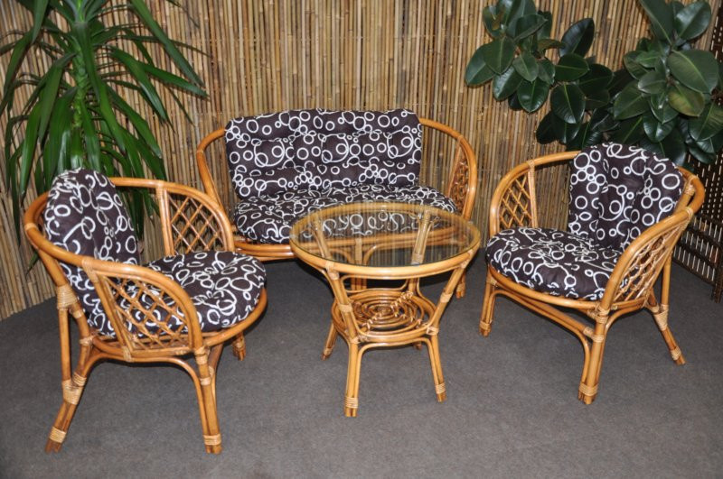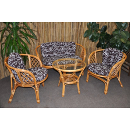 Ratanový nábytok - ratanová sedacia súprava je vyrobená z prírodného ratanu s farbou konštrukcie zodpovedajúcou fotografii výrobku, obsahuje lavicu, 2 kreslá a stolík so sklom, kompletnú sadu vankúšov vyrobených v Českej republike | Farba ratanovej konštrukcie je hnedá wash - medová s vypranou hnedou, vďaka čomu súprava získava originálny dizajn obľúbený najmä v Ázii. Spoje ratanovej konštrukcie sú skrutkované. Rozmer lavice 115x66x73 cm, nosnosť lavice 150 kg Rozmer kresla 68x66x73 cm, nosnosť kresla 110 kg Výška stola 55 cm, priemer stola 60 cm Vankúše možno prať ručne pri 40oC alebo chemicky čistiť