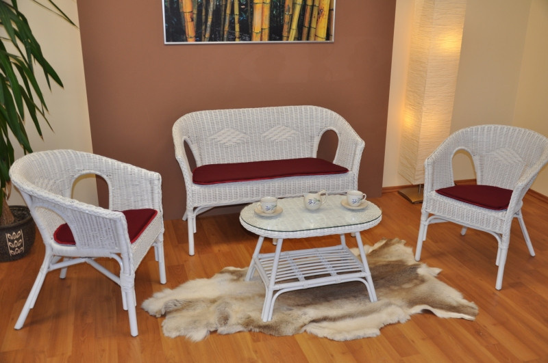 Ratanový nábytok - krásna ratanová sedacia súprava je vyrobená z prírodného ratanu. Ratanová súprava obsahuje 2 kreslá, pohovku, stolík so sklom a kompletnú sadu vankúšov podľa obrázka. | Pevná ratanová konštrukcia s výpletom z ratanového prútia s priemerom 3 mm. Farba ratanovej štruktúry a výpletu je biela. Rozmery stoličky sú 58x57x76 cm, nosnosť stoličky je 110. Rozmery pohovky sú 115x57x76 cm, nosnosť pohovky je 150 kg. Stôl so sklom má rozmery 70x42x45 cm Spoje ratanovej konštrukcie sú skrutkované. Materiál vankúšov je 100 % bavlna s penovou výplňou. Vankúšiky možno prať ručne.