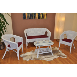 Ratanová pohovka Fabion veľká biela s bordovými vankúšikmi
