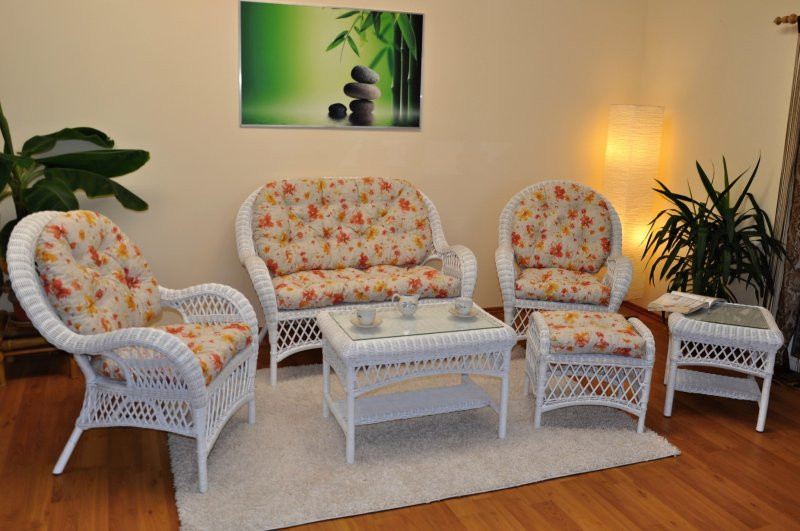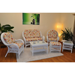 Krásna ratanová sedacia súprava z prírodného ratanu s rámom z pevných ratanových prútov a ratanového prútia. | Súprava je veľmi pohodlná vďaka prepracovanej a príjemne tvarovanej konštrukcii. Rozkladacie kreslá a pohovka poskytujú pohodlné sedenie vďaka širokým podrúčkam. Farba ratanovej konštrukcie a ratanového výpletu je biela. Rozmery pohovky sú 128x80x97 cm, výška sedadla pohovky je 45 cm, nosnosť pohovky je 200 kg. Rozmery kresla Florida sú 76x80x97 cm, nosnosť kresla je 130 kg a výška sedadla je 45 cm. Rozmery ratanovej stoličky Florida sú 52x40x48 cm, výška sedadla je 45 cm a nosnosť 120 kg. Konferenčný stolík Florida má rozmery 80x50x50 cm a dodáva sa so sklenenou doskou. Odkladací stolík Florida má rozmery 52x52x50 cm a je tiež vybavený sklenenou doskou. Vankúše sú vyrobené z kvalitnej čalúnnickej látky v Českej republike.