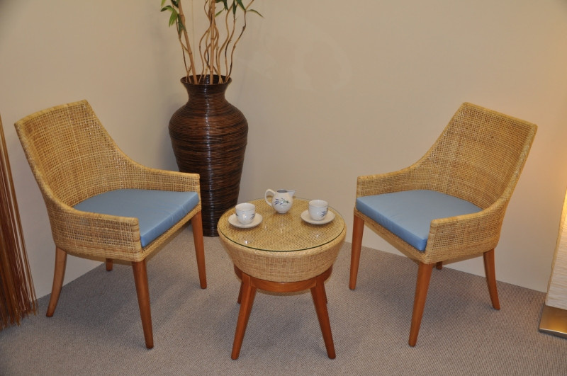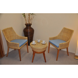 Ratanová sedacia súprava Nasvile pozostáva z dvoch kresiel s vankúšmi a stolíka so sklenenou doskou. | Krásna ratanová sedacia súprava s prvkami z masívneho mahagónového dreva. Rozmery stoličky sú 53x63x85 cm. Výška sedadla stoličky je 50 cm. Nosnosť stoličky je 125 kg. Rozmery stola so sklenenou doskou sú: priemer 52 cm, výška 52 cm.
