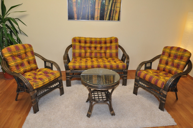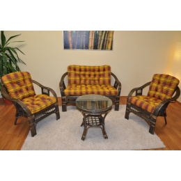 Ratanová sedacia súprava je vyrobená z prírodného ratanu z pevných ratanových prútov. Súprava obsahuje pohovku, 2 kreslá, stôl a sadu vankúšov. | Konštrukcia ratanovej sedacej súpravy je na väčšine miest trojitá, a teda veľmi pevná. Kreslá a pohovka sú veľmi pohodlné vďaka svojmu rozkladaciemu tvaru a kvalitným vankúšom. Farba ratanovej štruktúry a výpletu je hnedá. Rozmery pohovky sú 118x75x74 cm, nosnosť 180 kg. Rozmery stoličky sú 68x75x74 cm, nosnosť stoličky je 125 kg. Výška sedadla je 44 cm. Stôl má priemer 55 cm a výšku 55 cm.
