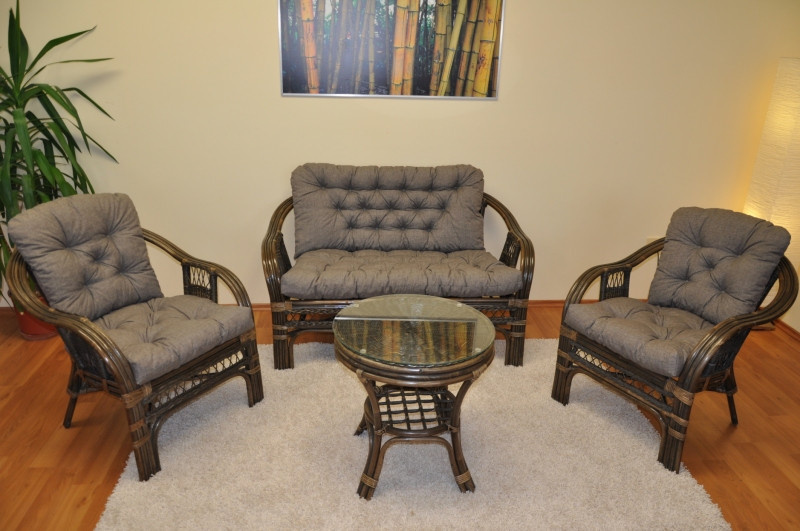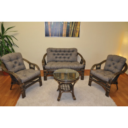 Ratanová sedacia súprava je vyrobená z prírodného ratanu z pevných ratanových prútov. Súprava obsahuje pohovku, 2 kreslá, stôl a sadu vankúšov. | Konštrukcia ratanovej sedacej súpravy je na väčšine miest trojitá, a teda veľmi pevná. Kreslá a pohovka sú veľmi pohodlné vďaka svojmu rozkladaciemu tvaru a kvalitným vankúšom. Farba ratanovej štruktúry a výpletu je hnedá. Rozmery pohovky sú 118x75x74 cm, nosnosť 180 kg. Rozmery stoličky sú 68x75x74 cm, nosnosť stoličky je 125 kg. Výška sedadla je 44 cm. Stôl má priemer 55 cm a výšku 55 cm.