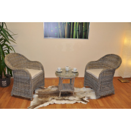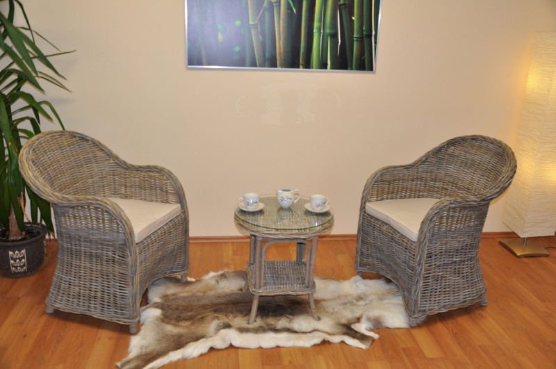 Krásna ratanová sedacia súprava z prírodného ratanu s kockami ratanu v sivej farbe. Súprava pozostáva z 2 pohodlných kresiel s vankúšmi a stolíka so sklenenou doskou. | Materiál konštrukcie je prírodný ratan kubu v prírodnej sivej farbe. Materiál je ratan kubu v prírodnej sivej farbe. Ratanové kubu sa vyznačuje veľkou pevnosťou a odolnosťou. Vďaka tomu má kreslo veľmi pevnú konštrukciu Rozmery kresla sú 64x63x85 cm, nosnosť kresla je 125 kg Rozmery stola sú: priemer 50 cm, výška 55 cm V súčasnosti ponúkame kreslá s vankúšom v hnedo-béžovej farbe, ktorý je zobrazený na druhej fotografii.