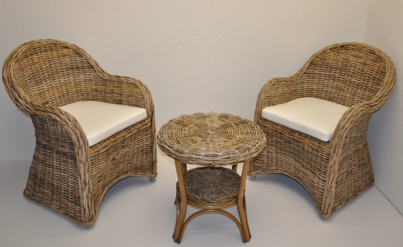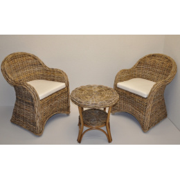Nádherná ratanová sedacia súprava vyrobená z prírodného ratanu s výpletom z ratanu kubu v šedej farbe. Súprava sa skladá z 2 pohodlných kresiel s poduškami a stolíka. | Materiál konštrukcie je prírodný ratan kubu v prírodnej šedej farbe. Materiál výpletu je ratan kubu v prírodnej šedej farbe. Ratan kubu sa vyznačuje veľkou pevnosťou a odolnosťou. Kreslo má vďaka tomu veľmi pevnú konštrukciu. Veľkosť kresla je 64x63x85 cm. Nosnosť kresla je 125 kg Veľkosť stolíka je: priemer 55 cm, výška 55 cm