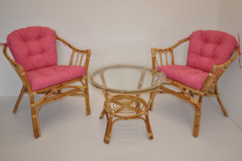 Ratanová sedacia súprava Subaliu sa skladá z dvoch kresiel, stolíka so sklenenou doskou a sady podušiek. | Ratanová sedacia súprava Subaliu je vyrobená z prírodného ratanu semambo, ktorý sa vyznačuje vysokou pevnosťou a stálosťou. Veľkosť kresla je 65x67x77 cm. Výška sedu kresla je 44 cm. Nosnosť kresla je 115 kg. Veľkosť stolíka so sklenenou doskou je: priemer 60 cm, výška 51 cm. Polstre na túto sedaciu súpravu sú vyrobené v Slovenskej republike. Polstre sú vyrobené z kvalitnej látky a vyznačujú sa vysokou kvalitou spracovania.Polstre pre nás vyrába firma AXIN Cuschions s.r.o., ktorá zamestnáva výhradne miestne vyučené krajčírky zo Slovenskej republiky. Týmto spôsobom sa snažíme podporovať výrobu a zamestnanosť v našej republike. Náplň podušiek je drvený molitan a podušky je možné prať ručne na 40o C. > >>