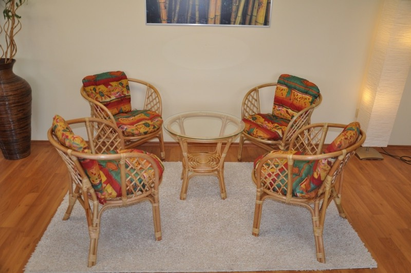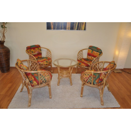 Ratanová sedacia súprava Bahama sa skladá zo štyroch kresiel s poduškami a stolíka so sklenenou doskou. | Sedacia súprava je vyrobená z prírodného ratanu. Farba ratanovej konštrukcie aj výpletu je medová. Veľkosť kresla 67x65x72 cm. Nosnosť kresla je 110 kg. Výška sedu kresla je 42 cm. Priemer sklenenej dosky stolíka je 60 cm, výška stolíka je 56 cm. Polstre sú vyrobené v Indonézii.