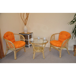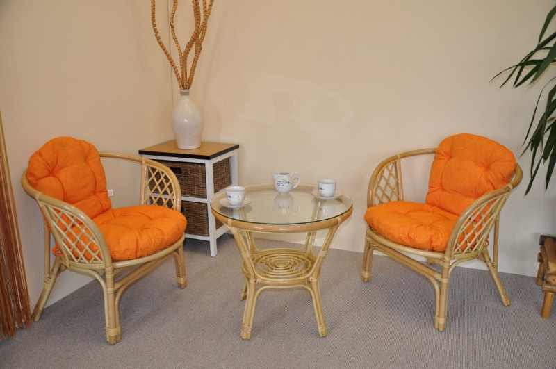 Sedacia súprava Bahama patrí stále medzi najobľúbenejšie ratanové sedacie súpravy. Súprava sa skladá z dvoch kresiel, stolíka so sklenenou doskou a kompletnej sady podušiek. | Farba ratanovej konštrukcie je medová. Materiál konštrukcie je prírodný ratan. Rozmer kresla je 68x66x73 cm, výška sedu 44 cm, nosnosť kresla je 110 kg. Stolík má výšku 55 cm, priemer stolíka 65 cm. Spoje ratanovej konštrukcie sú skrutkované. Polstre na túto sedaciu súpravu sú vyrobené v Slovenskej republike. Polstre sú vyrobené z kvalitnej látky a vyznačujú sa vysokou kvalitou spracovania.Polstre pre nás vyrába firma AXIN Cuschions s.r.o., ktorá zamestnáva výhradne miestne vyučené krajčírky zo Slovenskej republiky. Týmto spôsobom sa snažíme podporovať výrobu a zamestnanosť v našej republike. Náplň podušiek je drvený molitan a podušky je možné prať ručne na 40o C.