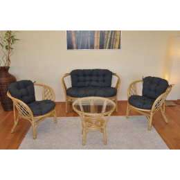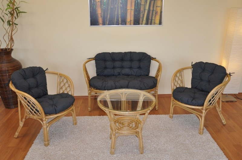 Ratanový nábytok - ratanová sedacia súprava Bahama je vyrobená z prírodného ratanu s farbou konštrukcie v medovom odtieni. Súprava obsahuje pohovku, 2 kreslá, stolík so sklom a kompletnú sadu veľmi kvalitných podušiek. | Farba ratanovej konštrukcie aj ratanového výpletu je medová. Veľkosť pohovky je 115x66x73 cm, nosnosť pohovky je 150 kg. Veľkosť kresla je 68x66x73 cm, nosnosť kresla je 110 kg. Výška sedu je 44 cm. Stolík má výšku 55 cm, priemer stolíka je 60 cm. Spoje ratanovej konštrukcie sú skrutkované. Polstre na túto sedaciu súpravu Bahama sú vyrobené v Slovenskej republike. Polstre sú vyrobené z kvalitnej látky a vyznačujú sa vysokou kvalitou spracovania.Polstre pre nás vyrába firma AXIN Cuschions s.r.o., ktorá zamestnáva výhradne miestne vyučené krajčírky zo Slovenskej republiky. Týmto spôsobom sa snažíme podporovať výrobu a zamestnanosť v našej republike.Náplň podušiek je drvený molitan a podušky je možné prať ručne na 40o C.