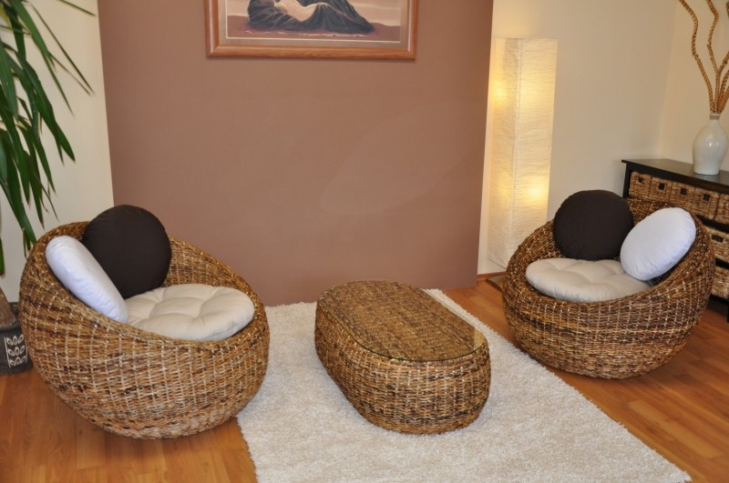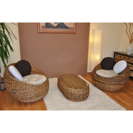 Super cena! Sedacia súprava z prírodného ratanu a výpletu z banánových listov pozostáva z dvoch kresiel, stolíka so sklenenou doskou a kompletnej sady vankúšov. | Konštrukcia sedacej súpravy je vyrobená z pevných ratanových tyčí, výplet je zo zväzkov listov banánovníka v prírodnej hnedej farbe. Rozmery stoličky sú 92x90x72 cm, nosnosť 150 kg Výška sedadla je 37 cm Rozmery stola sú 102x55x31 cm. Stôl sa dodáva so sklenenou doskou.