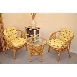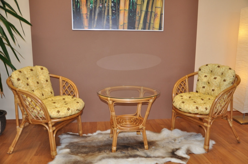 Ratanová sedacia súprava Jawa vychádza konštrukčne z veľmi obľúbenej sedacej súpravy Bahama. Sedaciu súpravu predávame ako celok 2 kresielka, stolík so sklom a sadu podušiek. | Sedacia súprava je vyrobená z prírodného ratanu. Farba ratanovej konštrukcie aj výpletu je medová. Veľkosť kresla 67x65x72 cm, nosnosť kresla je 110 kg, výška sedu je 42 cm. Priemer sklenenej dosky stolíka je 60 cm, výška stolíka je 56 cm. Polstre sú vyrobené v Indonézii.