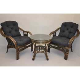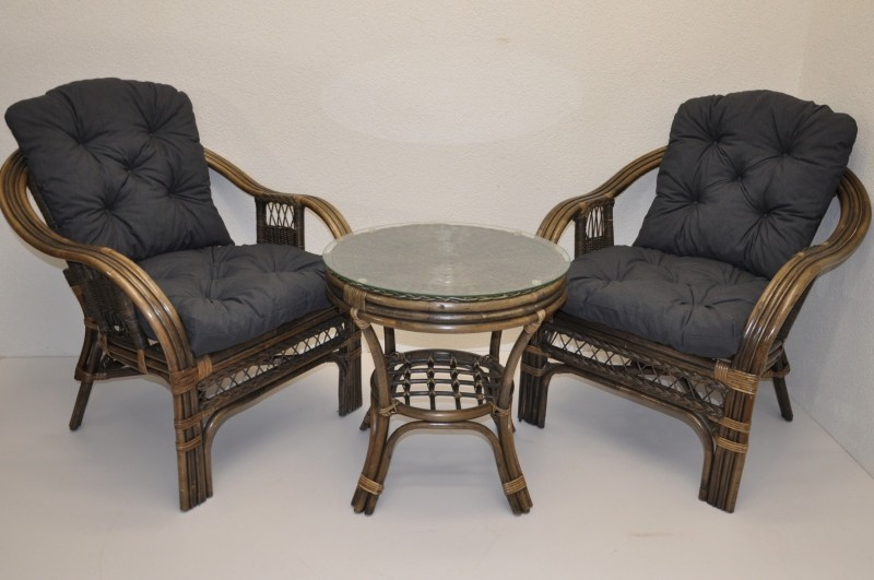 Ratanová sedacia súprava je vyrobená z prírodného ratanu z pevných ratanových prútov. Súprava obsahuje 2 kreslá, stôl a sadu vankúšov. | Konštrukcia ratanovej sedacej súpravy je na väčšine miest trojitá, a teda veľmi pevná. Kreslá sú veľmi pohodlné vďaka svojmu rozloženému tvaru a kvalitným vankúšom. Farba ratanovej štruktúry a výpletu je hnedá. Rozmery stoličky sú 68x75x74 cm, nosnosť stoličky je 125 kg. Výška sedadla je 44 cm. Stôl má priemer 55 cm a výšku 55 cm.