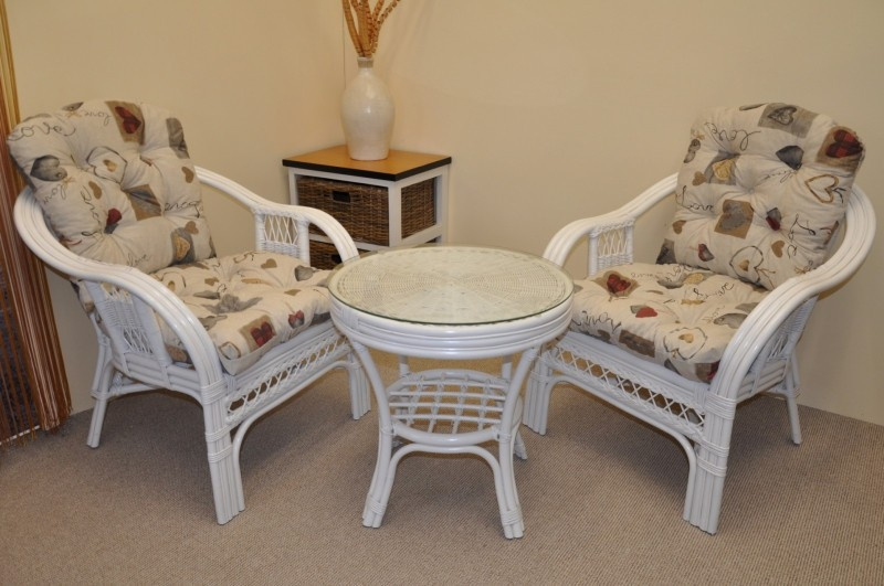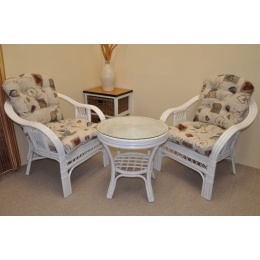 Ratanová sedacia súprava je vyrobená z prírodného ratanu z pevných ratanových prútov. Súprava obsahuje 2 kreslá, stôl a sadu vankúšov. | Konštrukcia ratanovej sedacej súpravy je na väčšine miest trojitá, a teda veľmi pevná. Kreslá sú veľmi pohodlné vďaka svojmu rozloženému tvaru a kvalitným vankúšom. Farba ratanovej štruktúry a výpletu je biela. Rozmery stoličky sú 68x75x74 cm, nosnosť stoličky je 125 kg. Výška sedadla je 44 cm. Stôl má priemer 55 cm a výšku 55 cm.