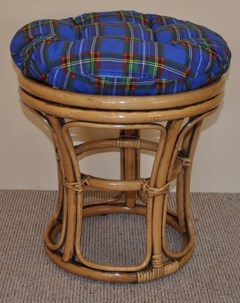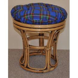 Ratanový nábytok - ratanová stolička s vankúšom. | Farba ratanovej konštrukcie je hnedá. Stolička je najprv nalakovaná medovou farbou. Po zaschnutí medovej farby sa stolička nalakuje hnedou batvou, ktorá sa pred zaschnutím zotrie, a tak zostane len na niektorých miestach, ako sú záhyby a prechody štruktúry. Priemer stoličky je 40 cm. Výška ratanovej konštrukcie stoličky je 40 cm. Nosnosť ratanovej stoličky je 110 kg. Kvalitný vankúš je vyrobený v Českej republike.