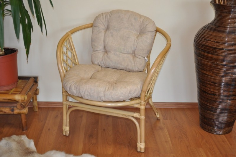 Ratanový nábytok - ratanové kreslo bahama samostatné s vankúšom podľa obrázka. | Farba ratanovej konštrukcie stoličky je medová. Nosnosť stoličky je 110 kg. Rozmery stoličky sú 68x66x73 cm. Výška sedadla je príjemných 43 cm. Kvalitný vankúš je vyrobený v ČESKEJ REPUBLIKE