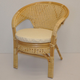 Ratanový nábytok - ratanové kreslo Kina je vyrobené z prírodného ratanu. Konštrukcia stoličky je vyrobená z pevných ratanových tyčí. | Rozmery stoličky sú 66x67x78 cm, nosnosť stoličky je 115 kg. Farba ratanovej konštrukcie a ratanového výpletu je medová. Vankúš je vyrobený v Českej republike.