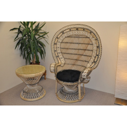 Kreslo King s výpletom z prírodného ratanu. | Konštrukcia stoličky je vyrobená z kombinácie pevných ratanových tyčí a kovu. Výplet je vyrobený z prírodného ratanu. Rozmery stoličky sú 113x75x150 cm. Nosnosť stoličky je 130 kg. Výška sedadla je 50 cm. Stôl so sklenenou doskou má priemer 60 cm a výšku 60 cm.
