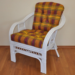 Kreslo Rio De Janeiro je vyrobené z prírodného ratanu. | Konštrukcia ratanovej stoličky je na väčšine miest trojitá, a teda veľmi pevná. Kreslo je veľmi pohodlné vďaka svojmu rozloženému tvaru a kvalitným vankúšom. Farba ratanovej konštrukcie a ratanového výpletu je biela. Rozmery stoličky sú 68x75x74 cm. Nosnosť stoličky je 125 kg. Výška sedadla je 44 cm. Vankúše na kreslá sa vyrábajú v Českej republike a vyznačujú sa vysokou kvalitou spracovania.